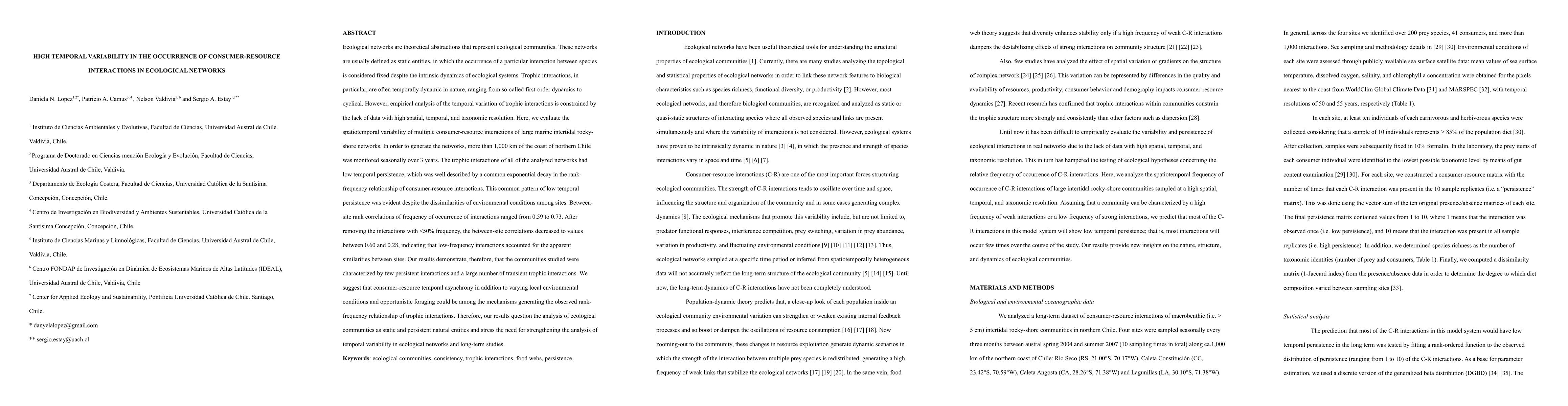 This study reveals high temporal variability in consumer-resource interactions within large marine ecological networks, showing low persistence and a common exponential decay in interaction frequency. The findings suggest that ecological communities are dynamic, challenging the static view of ecological networks and emphasizing the need for temporal analysis in ecological studies.