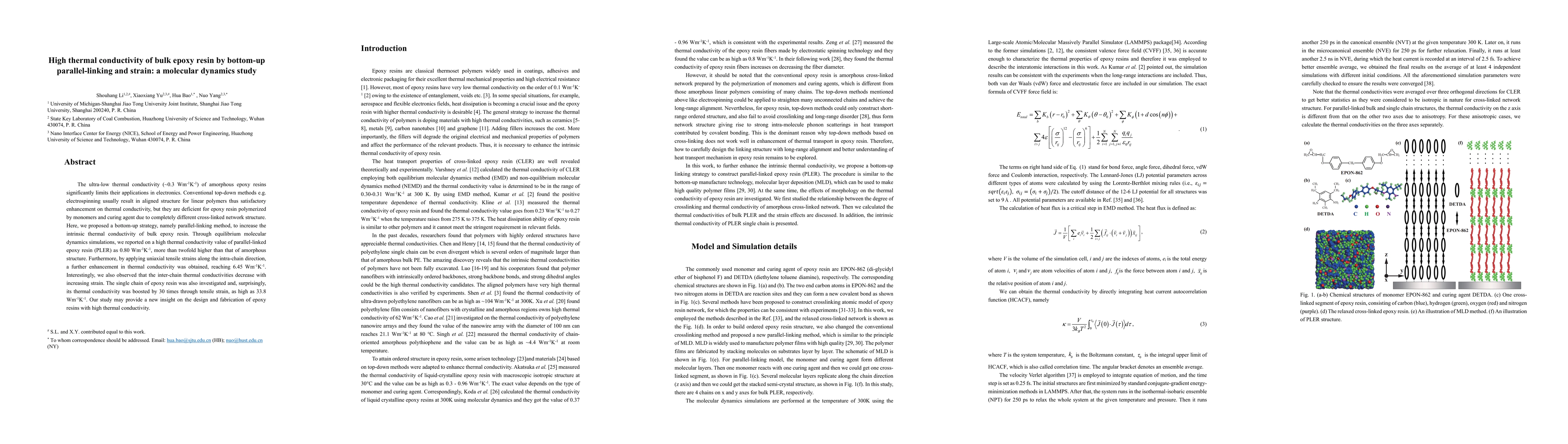 This study employs a bottom-up parallel-linking method to significantly enhance the thermal conductivity of bulk epoxy resin via molecular dynamics simulations. The resulting parallel-linked epoxy resin exhibited a thermal conductivity of 0.80 Wm⁻¹K⁻¹, and further mechanical strain boosted it to an extraordinary 6.45 Wm⁻¹K⁻¹, providing insights into advanced epoxy resin design.