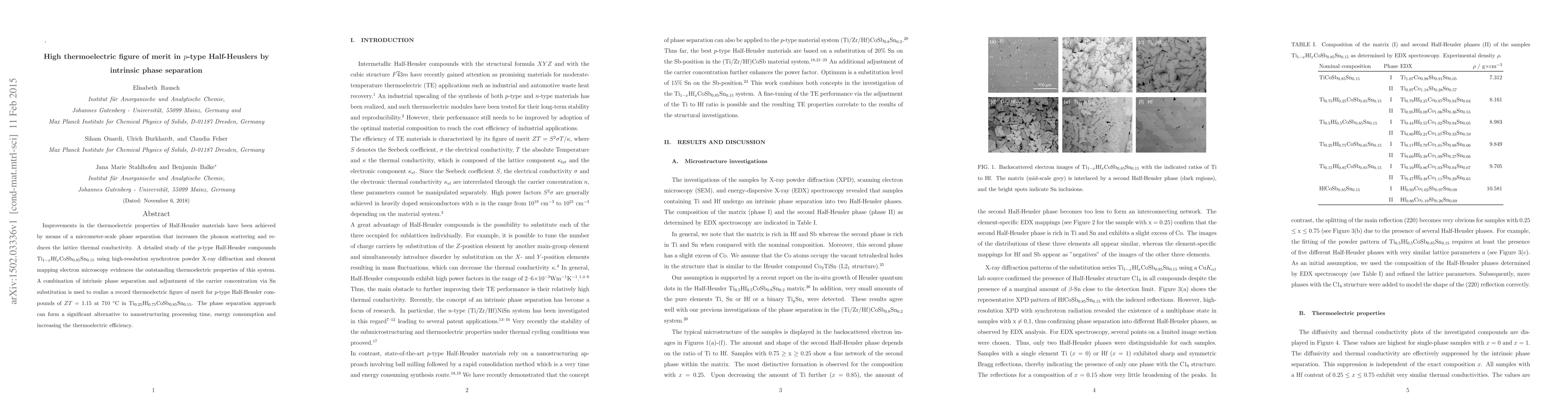 This study demonstrates that intrinsic phase separation in p-type Half-Heusler compounds, specifically Ti(1-x)Hf(x)CoSb0.85Sn0.15, significantly enhances thermoelectric properties by increasing phonon scattering and reducing lattice thermal conductivity. The optimized material achieved a record thermoelectric figure of merit (ZT) of around 1.15 at 710°C, showcasing a promising alternative to traditional nanostructuring methods.