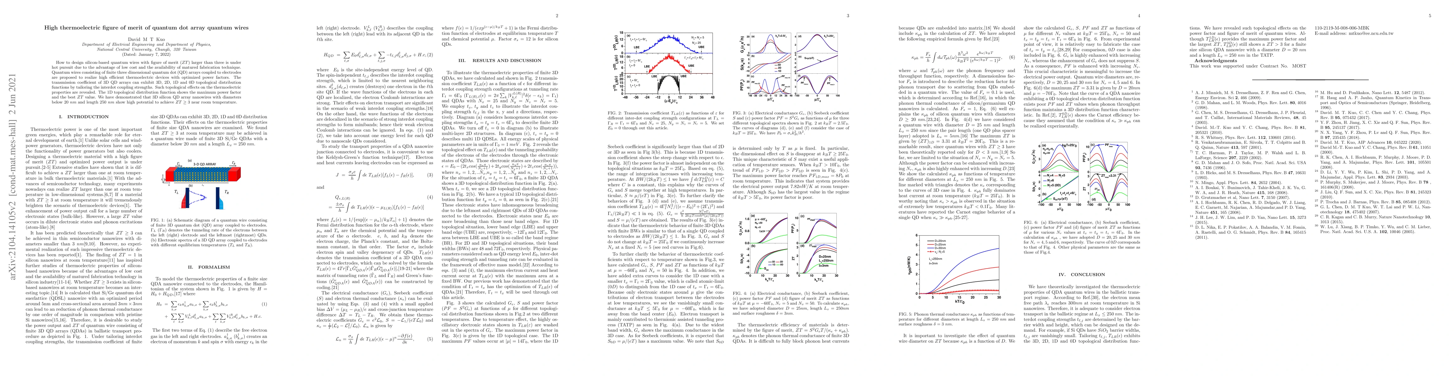 This paper proposes the design of silicon-based quantum wires with quantum dot arrays to achieve a high thermoelectric figure of merit ($ZT$) exceeding three. The study demonstrates that 1D topological distribution functions in 3D quantum dot arrays lead to optimal power factors and $ZT$ values, with 3D silicon nanowires showing potential for $ZT\ge 3$ near room temperature.