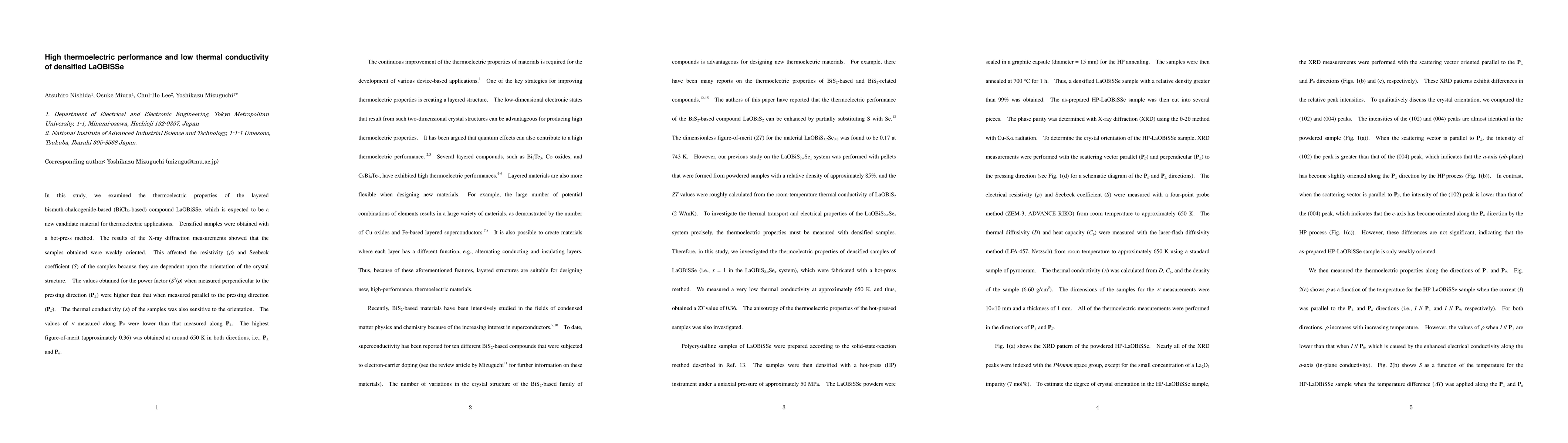 In this study, we examined the thermoelectric properties of the layered bismuth-chalcogenide-based (BiCh2-based) compound LaOBiSSe, which is expected to be a new candidate material for thermoelectric applications. Densified samples were obtained with a hot-press method. The results of the X-ray diffraction measurements showed that the samples obtained were weakly oriented. This affected the resistivity (r) and Seebeck coefficient (S) of the samples because they are dependent upon the orientation of the crystal structure. The values obtained for the power factor (S2/r) when measured perpendicular to the pressing direction (P1) were higher than that when measured parallel to the pressing direction (P2). The thermal conductivity (k) of the samples was also sensitive to the orientation. The values of k measured along P2 were lower than that measured along P1. The highest figure-of-merit (approximately 0.36) was obtained at around 650 K in both directions, i.e., P1 and P2.