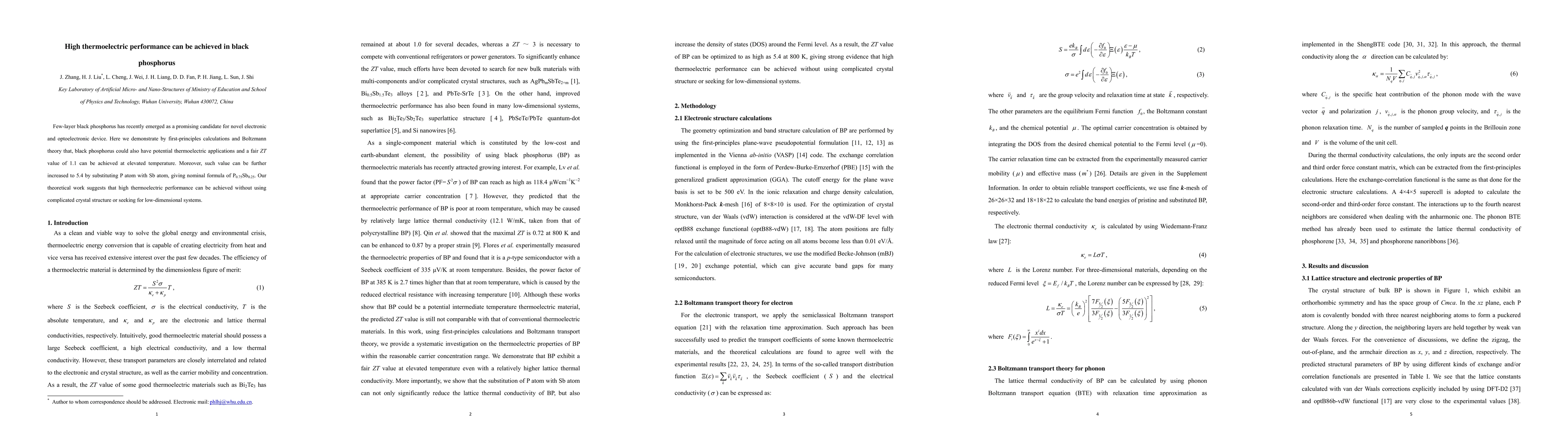 Black phosphorus exhibits promising thermoelectric performance with a ZT value of 1.1 at elevated temperatures, potentially enhanced to 5.4 by substituting P atoms with Sb, according to theoretical calculations. This suggests high thermoelectric efficiency can be achieved without complex structures.