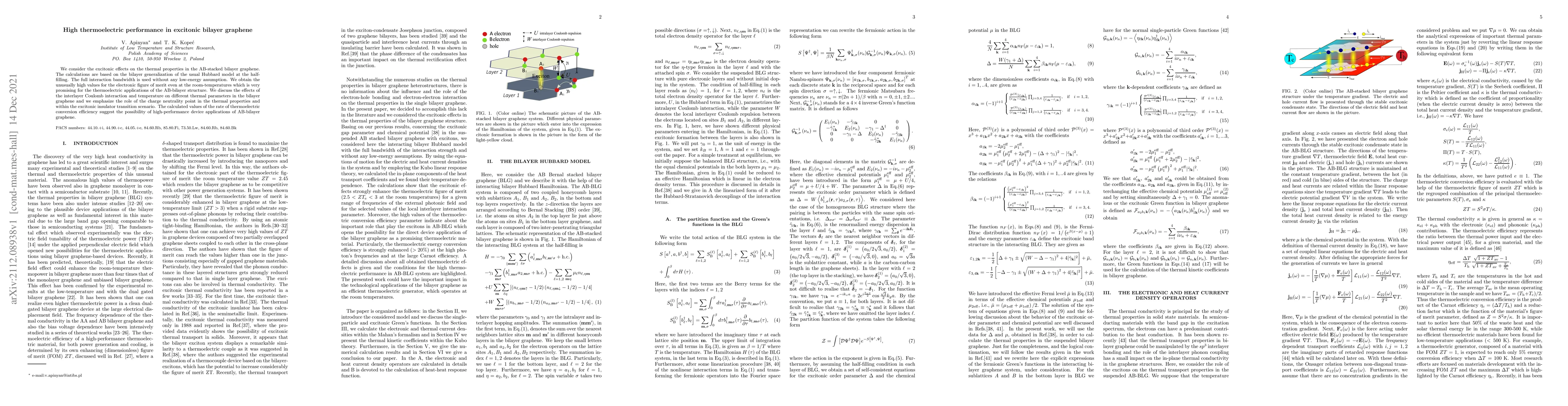 This study investigates excitonic effects in AB-stacked bilayer graphene, revealing high thermoelectric performance due to significant electronic figure of merit values at room temperature, promising for thermoelectric applications. The research emphasizes the impact of interlayer Coulomb interaction and temperature on thermal properties, highlighting the charge neutrality point's role in excitonic insulator transitions.