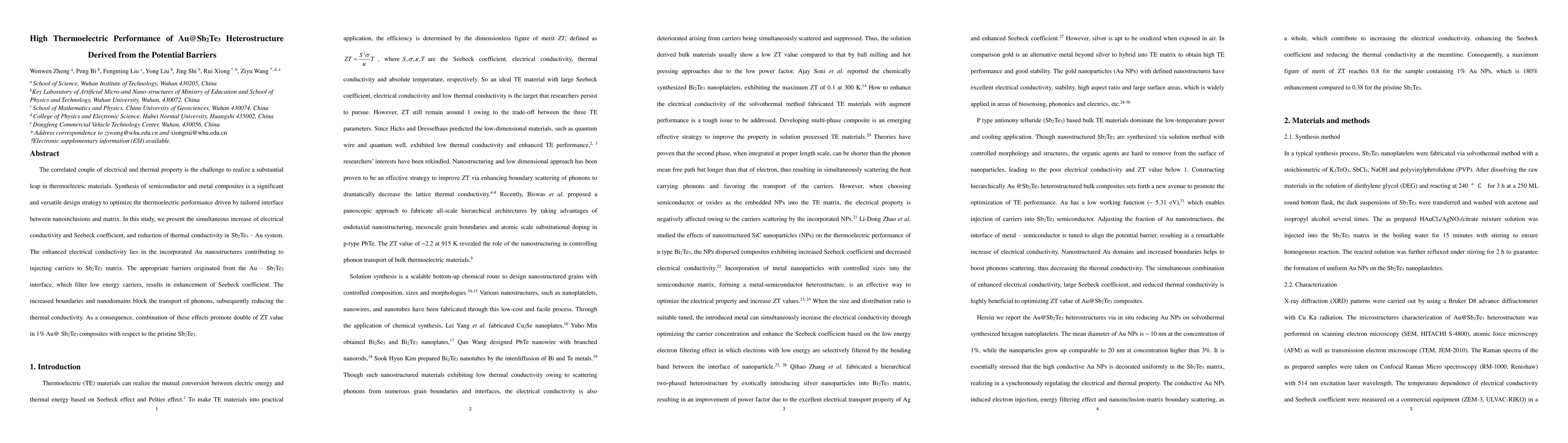 This paper investigates the thermoelectric performance of Au@Sb2Te3 heterostructures, showing a significant increase in electrical conductivity and Seebeck coefficient, alongside a reduction in thermal conductivity. The enhanced ZT value is attributed to the Au nanostructures and the potential barriers at the Au-Sb2Te3 interface, which improve carrier injection and phonon scattering.