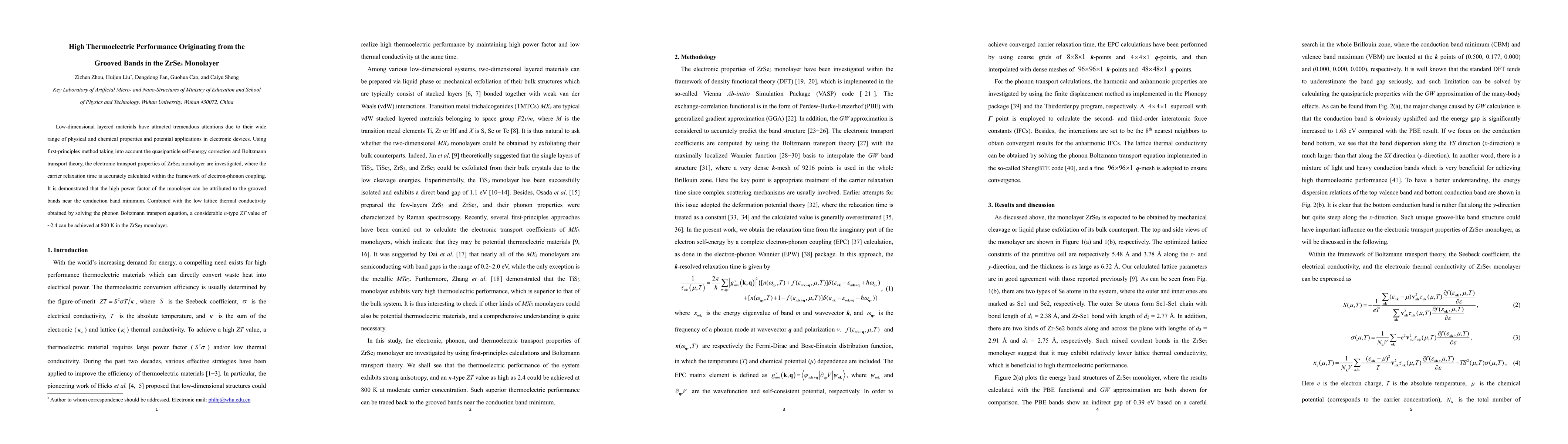 Low-dimensional layered materials have attracted tremendous attentions due to their wide range of physical and chemical properties and potential applications in electronic devices. Using first-principles method taking into account the quasiparticle self-energy correction and Boltzmann transport theory, the electronic transport properties of ZrSe3 monolayer are investigated, where the carrier relaxation time is accurately calculated within the framework of electron-phonon coupling. It is demonstrated that the high power factor of the monolayer can be attributed to the grooved bands near the conduction band minimum. Combined with the low lattice thermal conductivity obtained by solving the phonon Boltzmann transport equation, a considerable n-type ZT value of ~2.4 can be achieved at 800 K in the ZrSe3 monolayer.
