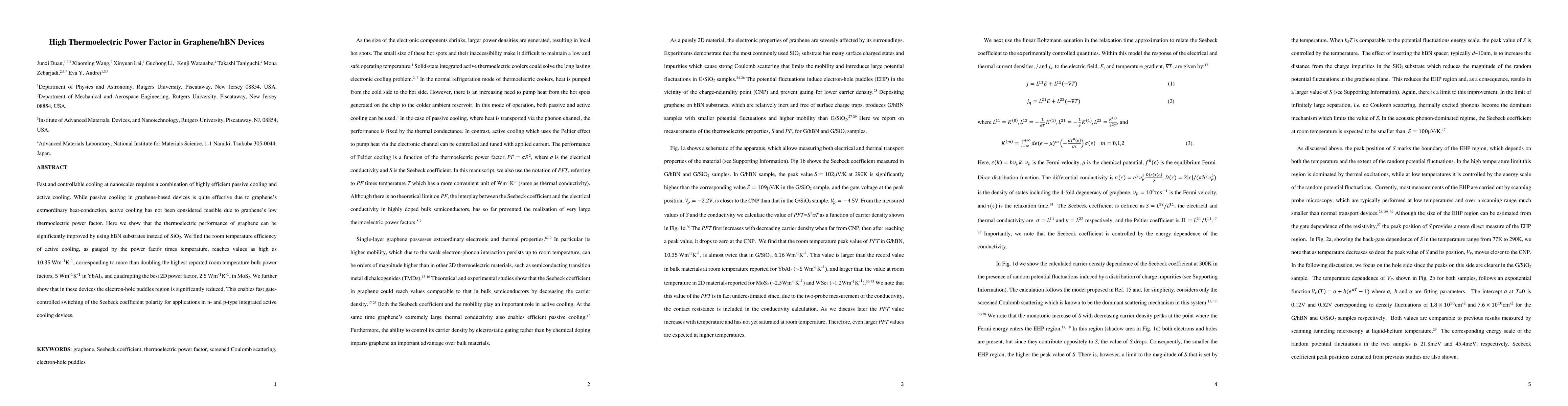This paper demonstrates that using hBN substrates enhances the thermoelectric performance of graphene devices, achieving a power factor of 10.35 W/mK, more than doubling the highest reported room temperature bulk power factor and quadrupling the best 2D power factor in MoS2. The reduced electron-hole puddles enable fast gate-controlled switching of the Seebeck coefficient polarity for active cooling applications.