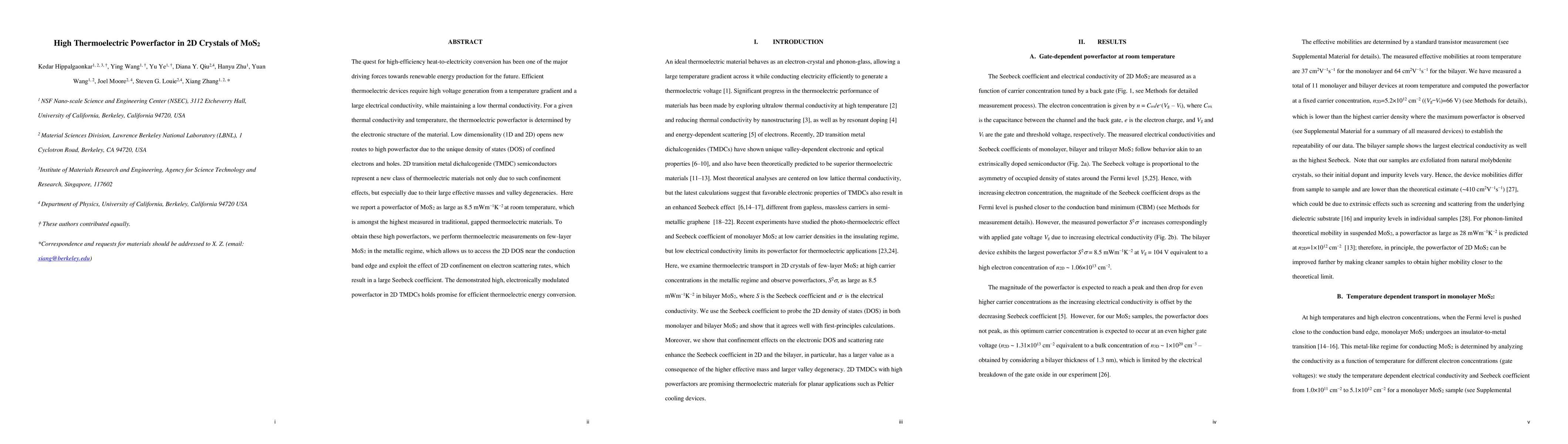 The quest for high-efficiency heat-to-electricity conversion has been one of the major driving forces towards renewable energy production for the future. Efficient thermoelectric devices require high voltage generation from a temperature gradient and a large electrical conductivity, while maintaining a low thermal conductivity. For a given thermal conductivity and temperature, the thermoelectric powerfactor is determined by the electronic structure of the material. Low dimensionality (1D and 2D) opens new routes to high powerfactor due to the unique density of states (DOS) of confined electrons and holes. 2D transition metal dichalcogenide (TMDC) semiconductors represent a new class of thermoelectric materials not only due to such confinement effects, but especially due to their large effective masses and valley degeneracies. Here we report a powerfactor of $MoS_2$ as large as $8.5 mWm^{-1}K^{-2}$ at room temperature, which is amongst the highest measured in traditional, gapped thermoelectric materials. To obtain these high powerfactors, we perform thermoelectric measurements on few-layer $MoS_2$ in the metallic regime, which allows us to access the 2D DOS near the conduction band edge and exploit the effect of 2D confinement on electron scattering rates, which result in a large Seebeck coefficient. The demonstrated high, electronically modulated powerfactor in 2D TMDCs holds promise for efficient thermoelectric energy conversion.