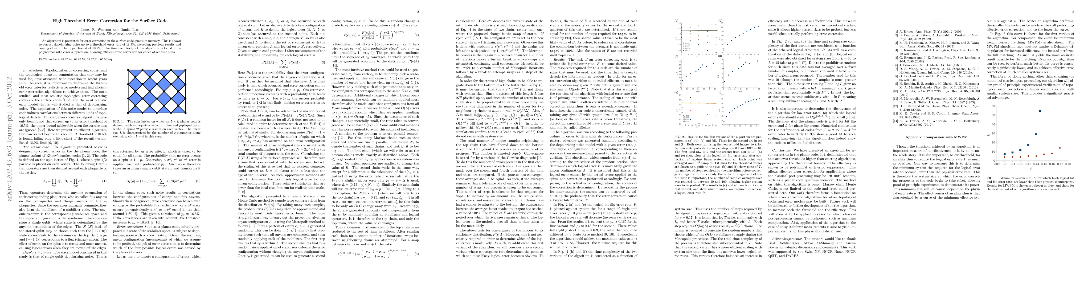 This paper introduces an advanced algorithm for error correction in surface code quantum memory, achieving a threshold error rate of 18.5% for depolarizing noise, surpassing previous results and nearing the theoretical limit of 18.9%. The algorithm's polynomial time complexity ensures practical efficiency for large-scale codes.