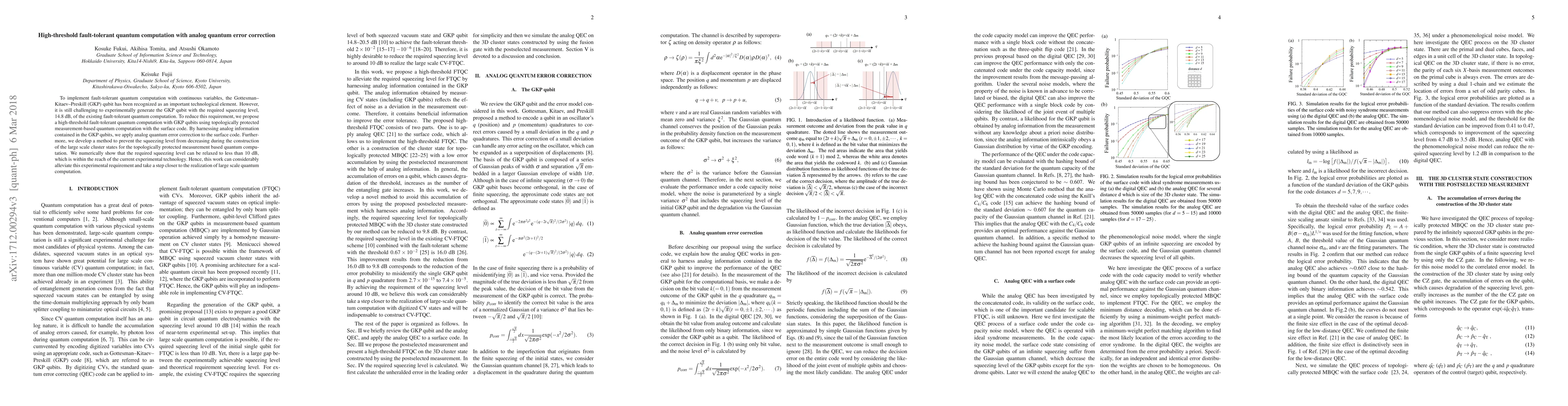 This paper proposes a method for high-threshold fault-tolerant quantum computation using GKP qubits with topologically protected measurement-based quantum computation and analog quantum error correction. The technique relaxes the required squeezing level to under 10 dB, making it experimentally feasible.