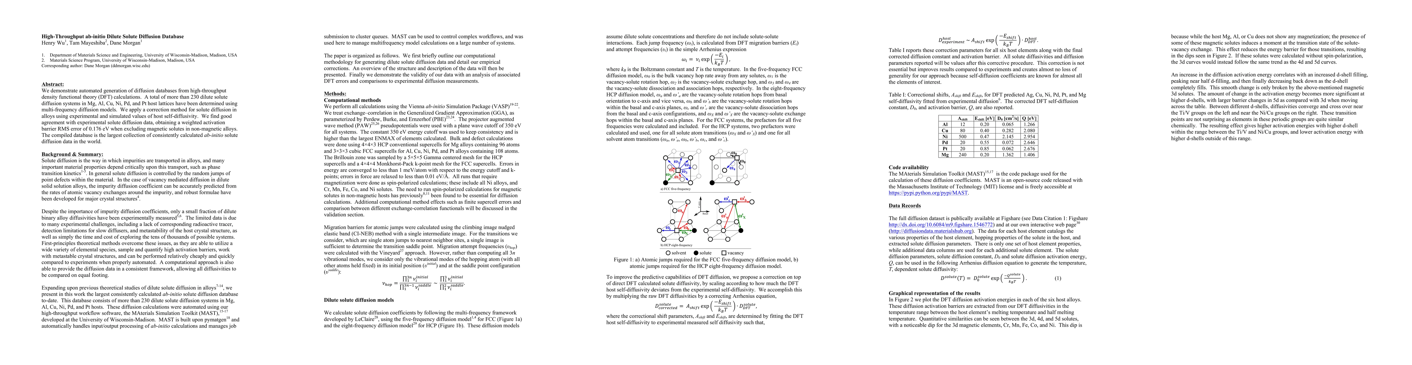 This study presents an extensive database of ab-initio solute diffusion rates generated through high-throughput density functional theory calculations for over 230 dilute solute systems in various host lattices. The database shows good agreement with experimental data, providing valuable insights into solute diffusion mechanisms in metals.
