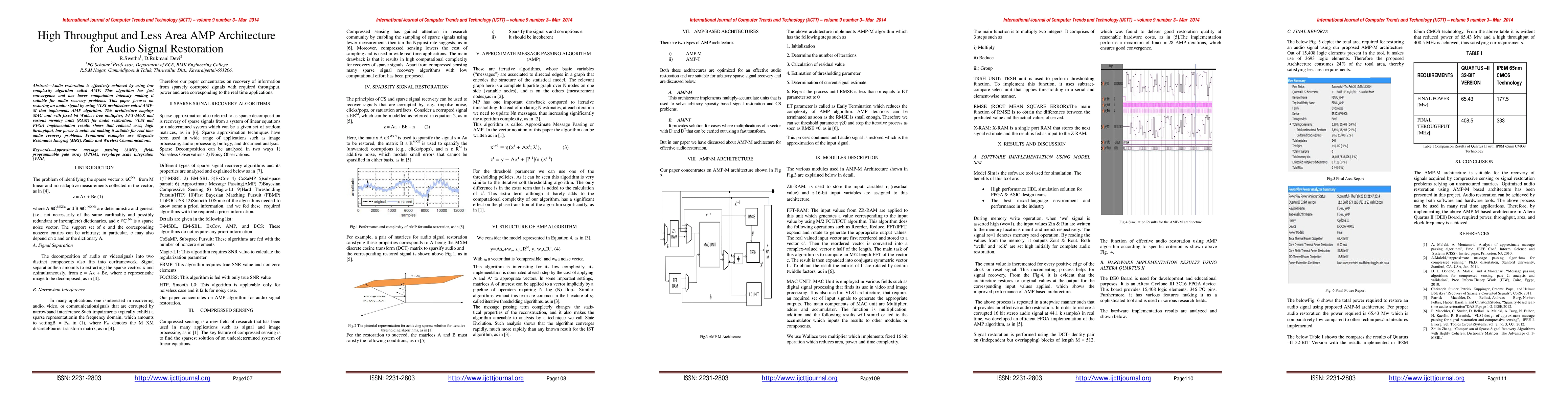 Audio restoration is effectively achieved by using low complexity algorithm called AMP. This algorithm has fast convergence and has lower computation intensity making it suitable for audio recovery problems. This paper focuses on restoring an audio signal by using VLSI architecture called AMP-M that implements AMP algorithm. This architecture employs MAC unit with fixed bit Wallace tree multiplier, FFT-MUX and various memory units (RAM) for audio restoration. VLSI and FPGA implementation results shows that reduced area, high throughput, low power is achieved making it suitable for real time audio recovery problems. Prominent examples are Magnetic Resonance Imaging (MRI), Radar and Wireless Communications.