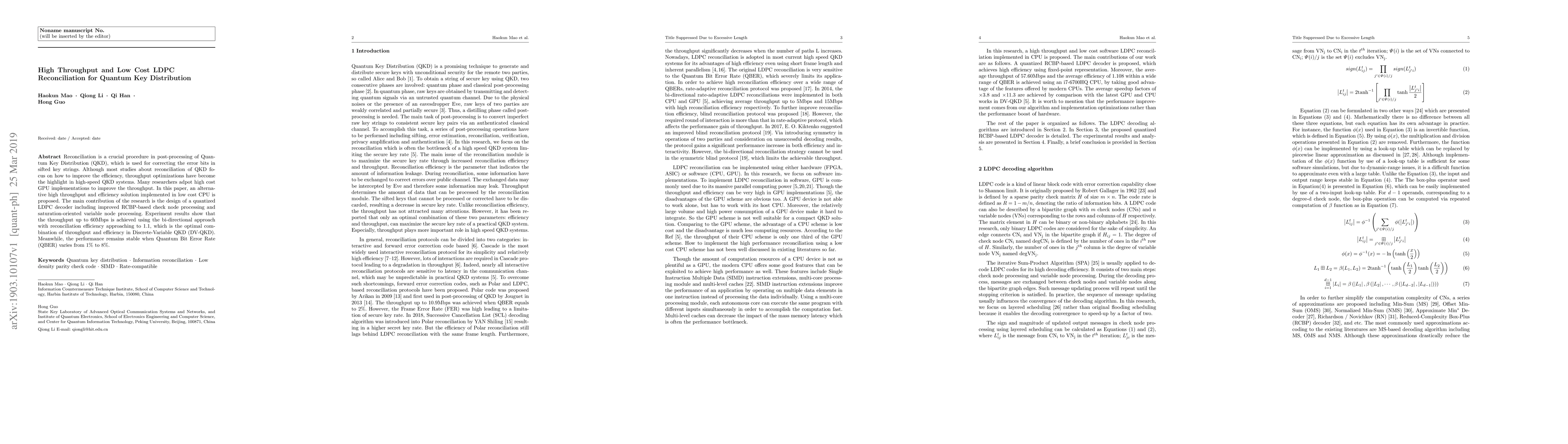 Researchers propose a low-cost CPU-based solution for high-speed Quantum Key Distribution (QKD) reconciliation, achieving throughput of 60Mbps with efficiency approaching optimal levels, suitable for various QBER values.