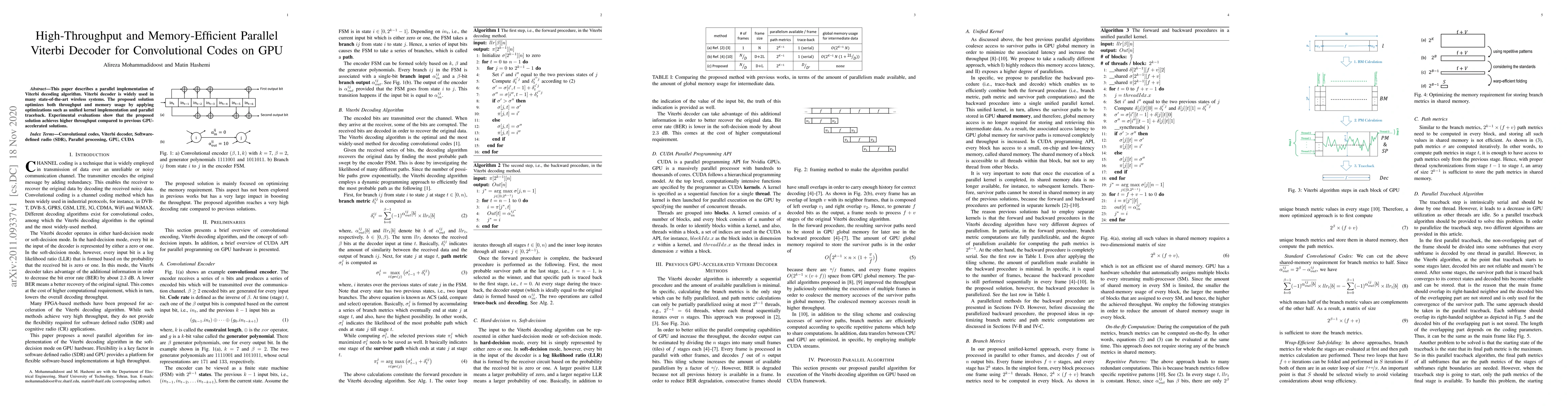 This paper presents a high-throughput and memory-efficient parallel Viterbi decoder for convolutional codes on GPU, optimizing throughput and memory usage through unified kernel implementation and parallel traceback, achieving superior performance over existing GPU-based solutions.