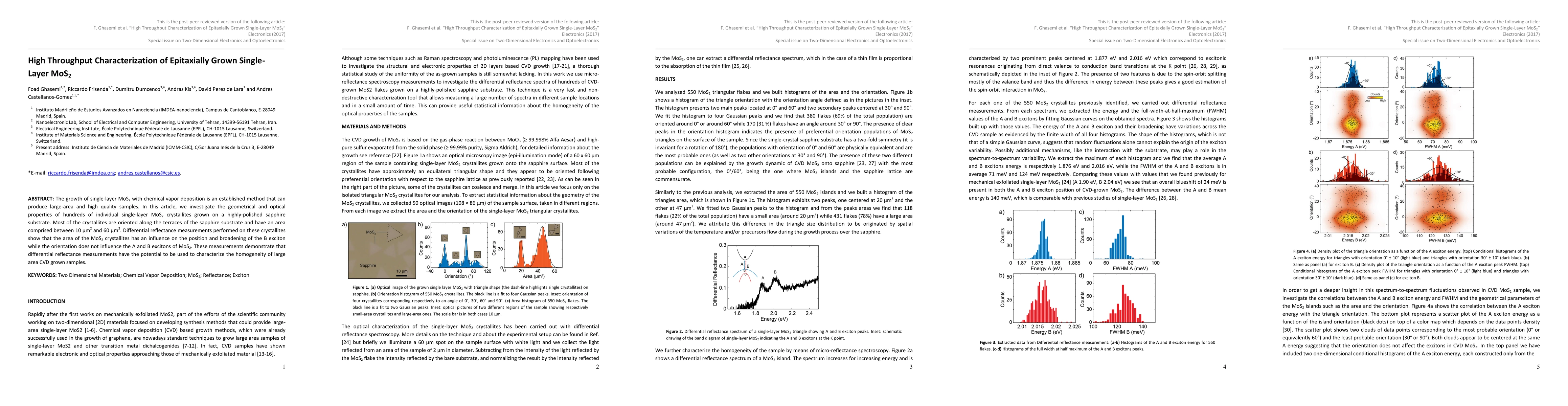 The growth of single-layer MoS2 with chemical vapor deposition is an established method that can produce large-area and high quality samples. In this article, we investigate the geometrical and optical properties of hundreds of individual single-layer MoS2 crystallites grown on a highly-polished sapphire substrate. Most of the crystallites are oriented along the terraces of the sapphire substrate and have an area comprised between 10 {\mu}m2 and 60 {\mu}m2. Differential reflectance measurements performed on these crystallites show that the area of the MoS2 crystallites has an influence on the position and broadening of the B exciton while the orientation does not influence the A and B excitons of MoS2. These measurements demonstrate that differential reflectance measurements have the potential to be used to characterize the homogeneity of large area CVD grown samples.