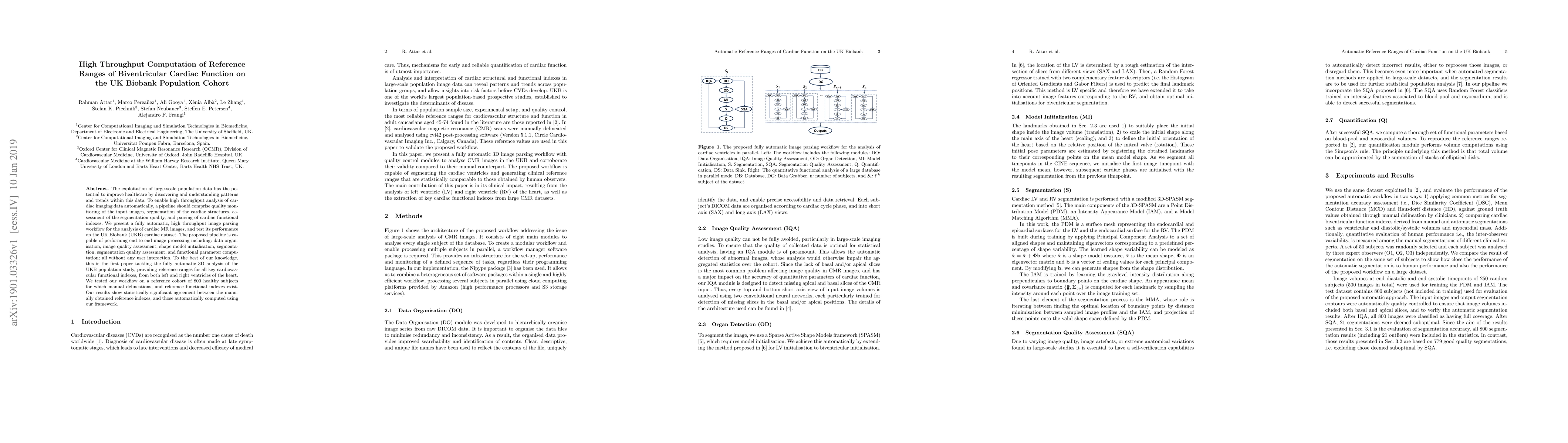 The exploitation of large-scale population data has the potential to improve healthcare by discovering and understanding patterns and trends within this data. To enable high throughput analysis of cardiac imaging data automatically, a pipeline should comprise quality monitoring of the input images, segmentation of the cardiac structures, assessment of the segmentation quality, and parsing of cardiac functional indexes. We present a fully automatic, high throughput image parsing workflow for the analysis of cardiac MR images, and test its performance on the UK Biobank (UKB) cardiac dataset. The proposed pipeline is capable of performing end-to-end image processing including: data organisation, image quality assessment, shape model initialisation, segmentation, segmentation quality assessment, and functional parameter computation; all without any user interaction. To the best of our knowledge,this is the first paper tackling the fully automatic 3D analysis of the UKB population study, providing reference ranges for all key cardiovascular functional indexes, from both left and right ventricles of the heart. We tested our workflow on a reference cohort of 800 healthy subjects for which manual delineations, and reference functional indexes exist. Our results show statistically significant agreement between the manually obtained reference indexes, and those automatically computed using our framework.