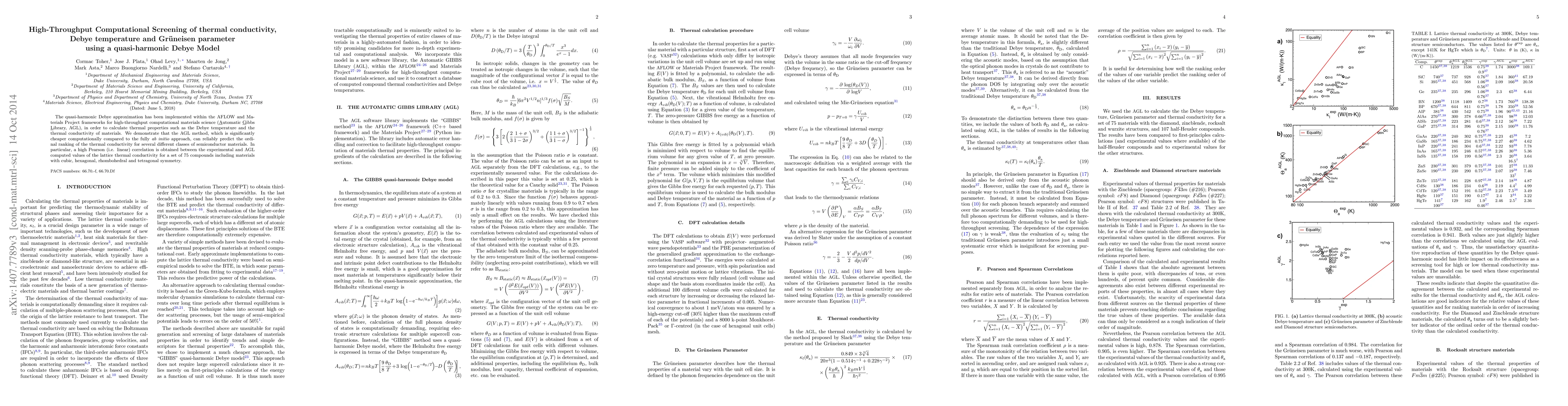 This study introduces a quasi-harmonic Debye model within AFLOW and Materials Project frameworks for high-throughput computational screening of thermal properties. The model effectively predicts the thermal conductivity and Debye temperature, showing that the Debye temperature is a more reliable predictor of experimental thermal conductivities than calculated conductivity.