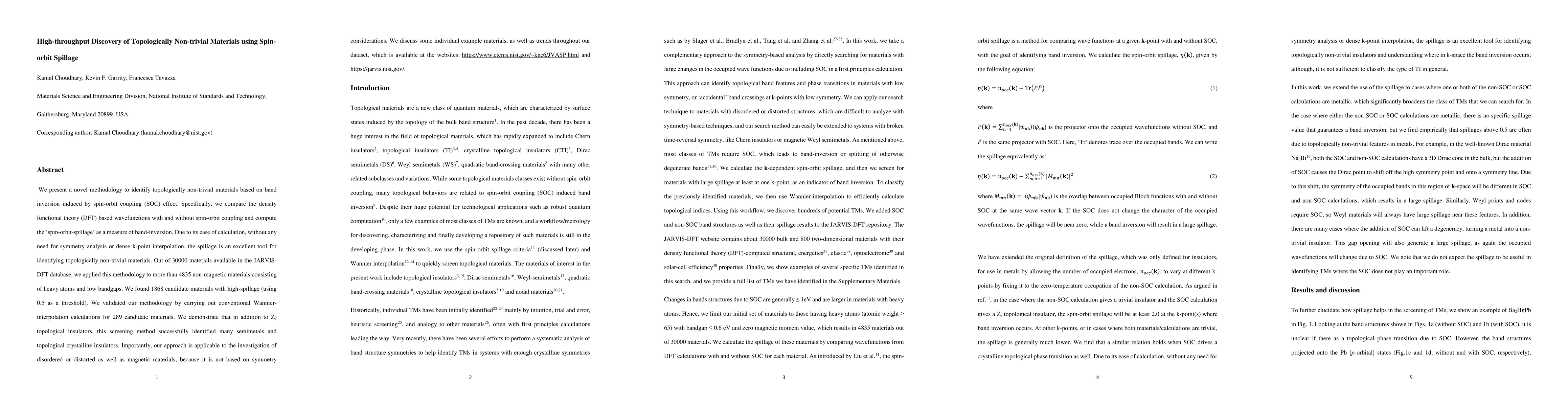 We present a novel methodology to identify topologically non-trivial materials based on band inversion induced by spin-orbit coupling (SOC) effect. Specifically, we compare the density functional theory (DFT) based wavefunctions with and without spin-orbit coupling and compute the spin-orbit-spillage as a measure of band-inversion. Due to its ease of calculation, without any need for symmetry analysis or dense k-point interpolation, the spillage is an excellent tool for identifying topologically non-trivial materials. Out of 30000 materials available in the JARVIS-DFT database, we applied this methodology to more than 4835 non-magnetic materials consisting of heavy atoms and low bandgaps. We found 1868 candidate materials with high-spillage (using 0.5 as a threshold). We validated our methodology by carrying out conventional Wannier-interpolation calculations for 289 candidate materials. We demonstrate that in addition to Z2 topological insulators, this screening method successfully identified many semimetals and topological crystalline insulators. Importantly, our approach is applicable to the investigation of disordered or distorted as well as magnetic materials, because it is not based on symmetry considerations. We discuss some individual example materials, as well as trends throughout our dataset, which is available at the websites: https://www.ctcms.nist.gov/~knc6/JVASP.html and https://jarvis.nist.gov/.