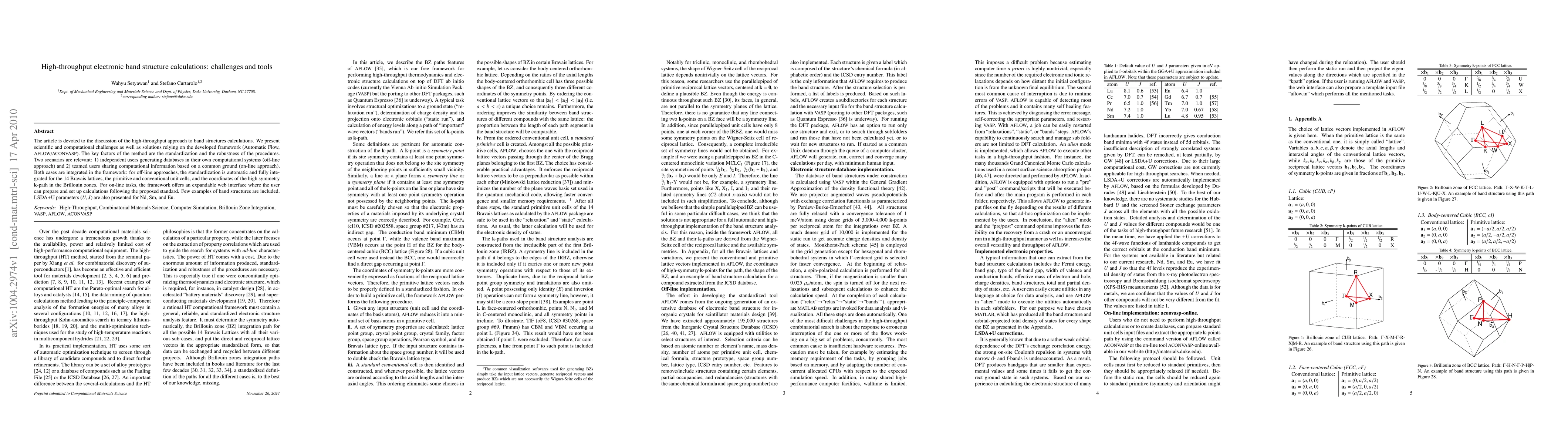 The article is devoted to the discussion of the high-throughput approach to band structures calculations. We present scientific and computational challenges as well as solutions relying on the developed framework (Automatic Flow, AFLOW/ACONVASP). The key factors of the method are the standardization and the robustness of the procedures. Two scenarios are relevant: 1) independent users generating databases in their own computational systems (off-line approach) and 2) teamed users sharing computational information based on a common ground (on-line approach). Both cases are integrated in the framework: for off-line approaches, the standardization is automatic and fully integrated for the 14 Bravais lattices, the primitive and conventional unit cells, and the coordinates of the high symmetry k-path in the Brillouin zones. For on-line tasks, the framework offers an expandable web interface where the user can prepare and set up calculations following the proposed standard. Few examples of band structures are included. LSDA+U parameters (U, J) are also presented for Nd, Sm, and Eu.