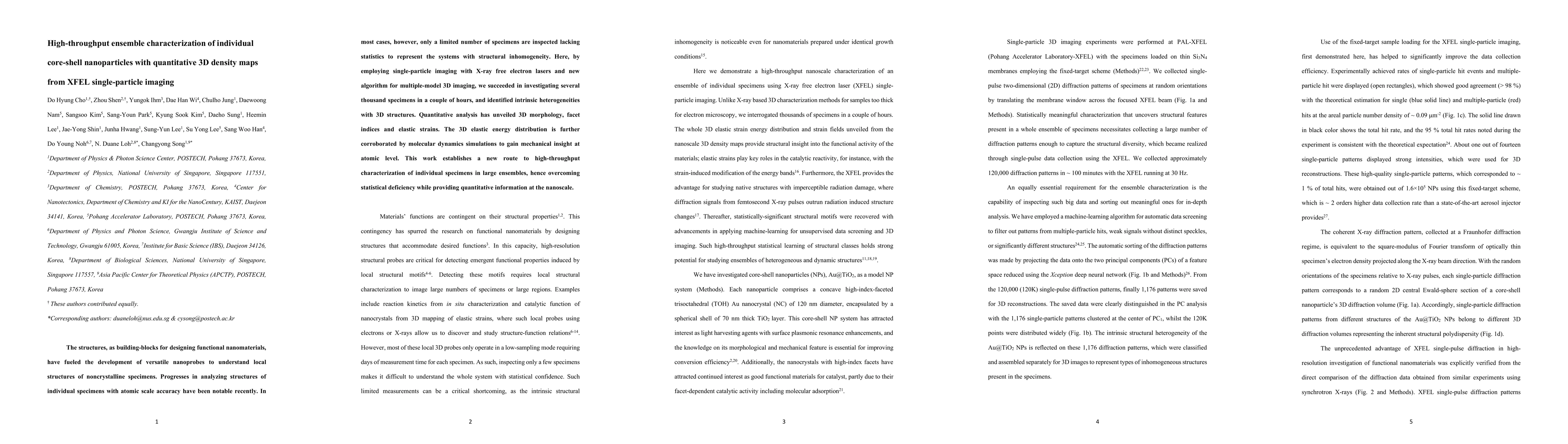 This paper presents a high-throughput method for characterizing individual core-shell nanoparticles using XFEL single-particle imaging, enabling the analysis of thousands of specimens in hours to reveal structural inhomogeneities and quantitative 3D density. The study combines advanced imaging techniques with molecular dynamics simulations to provide detailed mechanical insights at the atomic level.