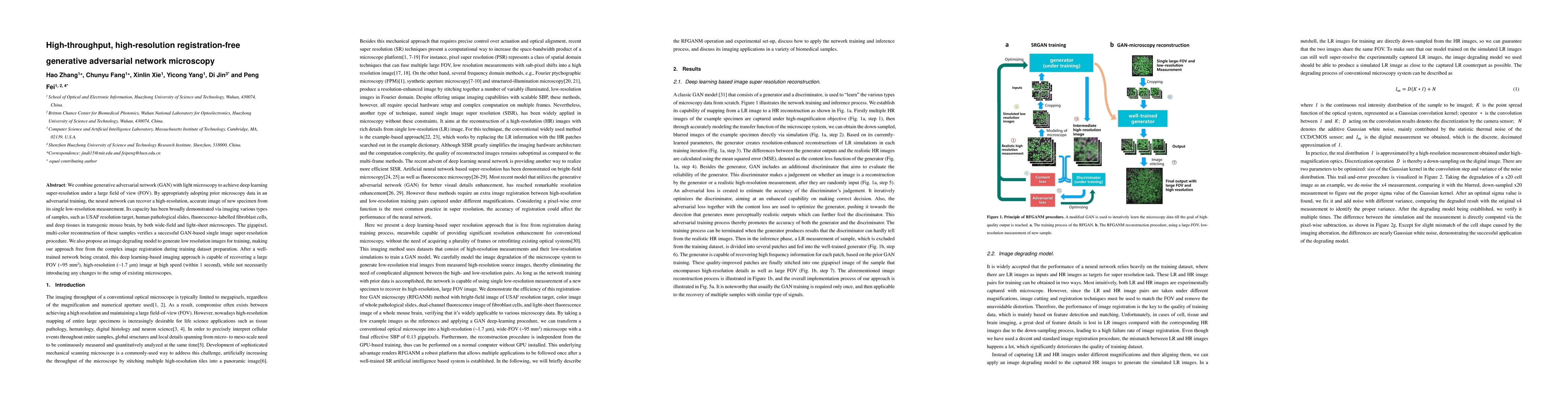 We combine generative adversarial network (GAN) with light microscopy to achieve deep learning super-resolution under a large field of view (FOV). By appropriately adopting prior microscopy data in an adversarial training, the neural network can recover a high-resolution, accurate image of new specimen from its single low-resolution measurement. Its capacity has been broadly demonstrated via imaging various types of samples, such as USAF resolution target, human pathological slides, fluorescence-labelled fibroblast cells, and deep tissues in transgenic mouse brain, by both wide-field and light-sheet microscopes. The gigapixel, multi-color reconstruction of these samples verifies a successful GAN-based single image super-resolution procedure. We also propose an image degrading model to generate low resolution images for training, making our approach free from the complex image registration during training dataset preparation. After a welltrained network being created, this deep learning-based imaging approach is capable of recovering a large FOV (~95 mm2), high-resolution (~1.7 {\mu}m) image at high speed (within 1 second), while not necessarily introducing any changes to the setup of existing microscopes.