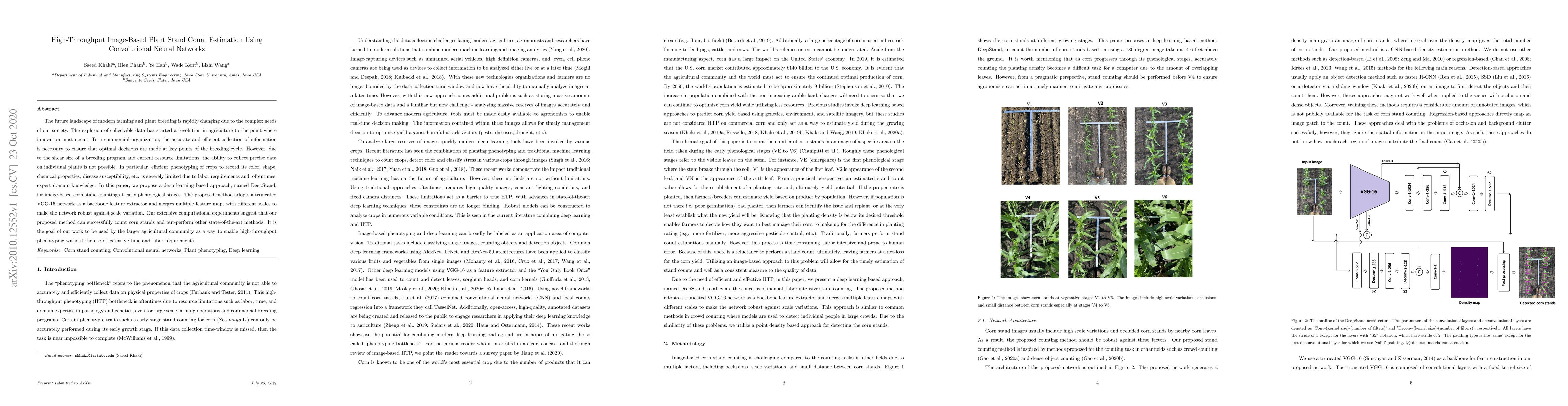 This paper proposes DeepStand, a convolutional neural network for high-throughput image-based corn stand count estimation at early growth stages, utilizing a truncated VGG-16 network and multi-scale feature maps. The method outperforms existing techniques, aiming to facilitate efficient, labor-saving phenotyping in agriculture.