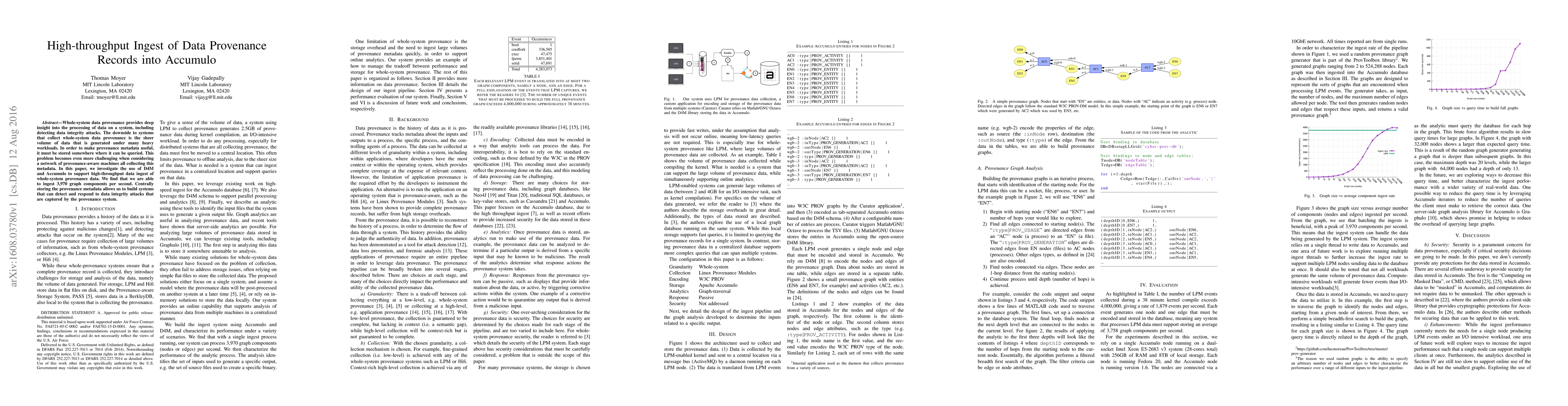 This paper explores using D4M and Accumulo for high-throughput ingestion of large volumes of whole-system data provenance records, achieving a rate of 3,970 graph components per second. Centrally stored provenance metadata enables detection and response to data integrity attacks.