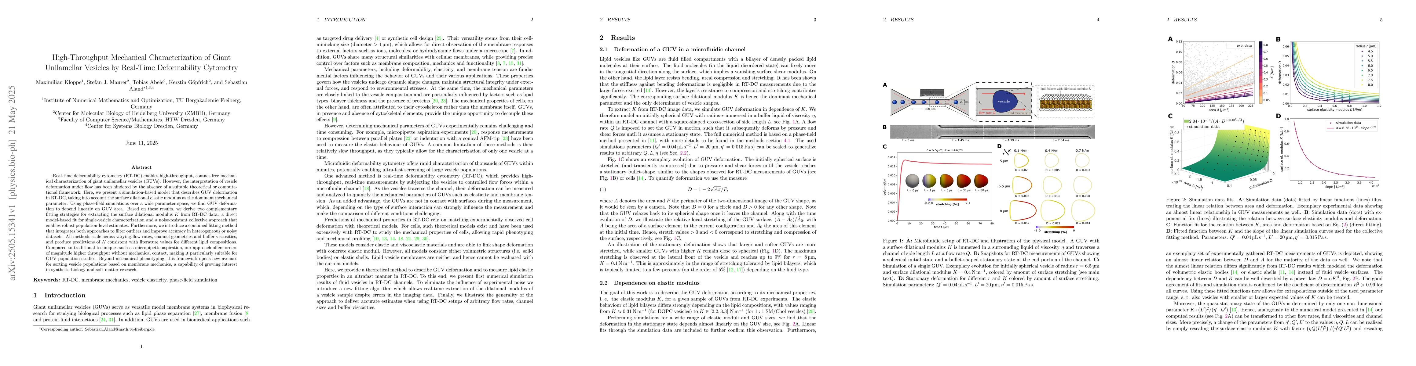 The research employs real-time deformability cytometry (RT-DC) to characterize giant unilamellar vesicles (GUVs) mechanically. Phase-field simulations are utilized over a broad parameter space to describe GUV deformation in RT-DC, focusing on the surface dilational elastic modulus (K).