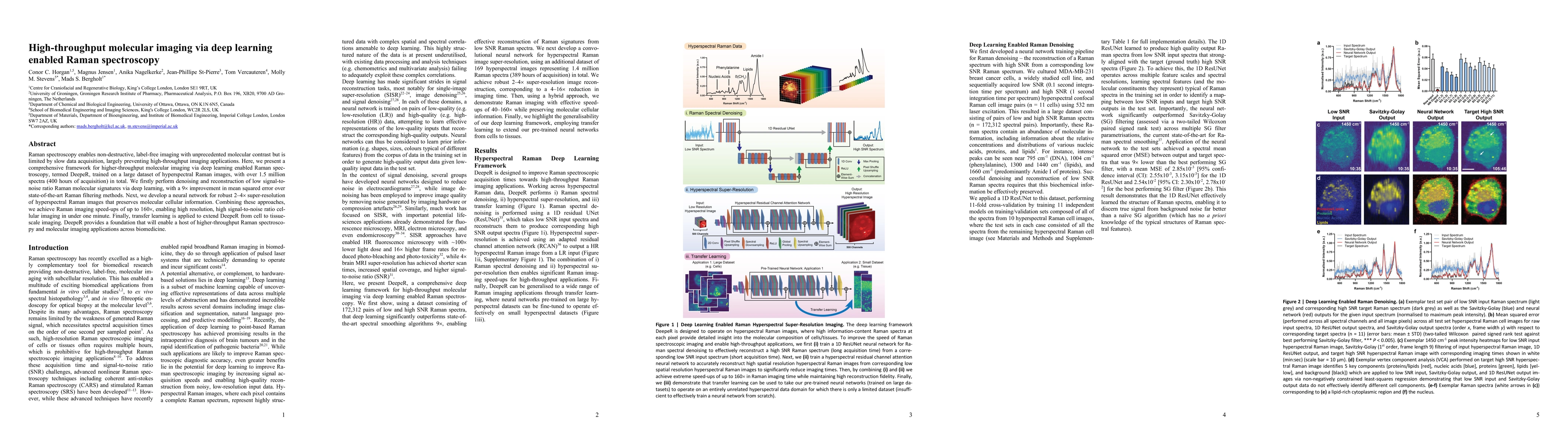 This paper introduces DeepeR, a deep learning framework that enhances high-throughput Raman spectroscopy by significantly improving data acquisition speed through denoising, reconstruction, and super-resolution techniques, achieving up to 160x speed-ups and enabling high-resolution cellular imaging in under a minute. Transfer learning extends its applicability from cellular to tissue-scale imaging, paving the way for advanced molecular imaging applications in biomedicine.