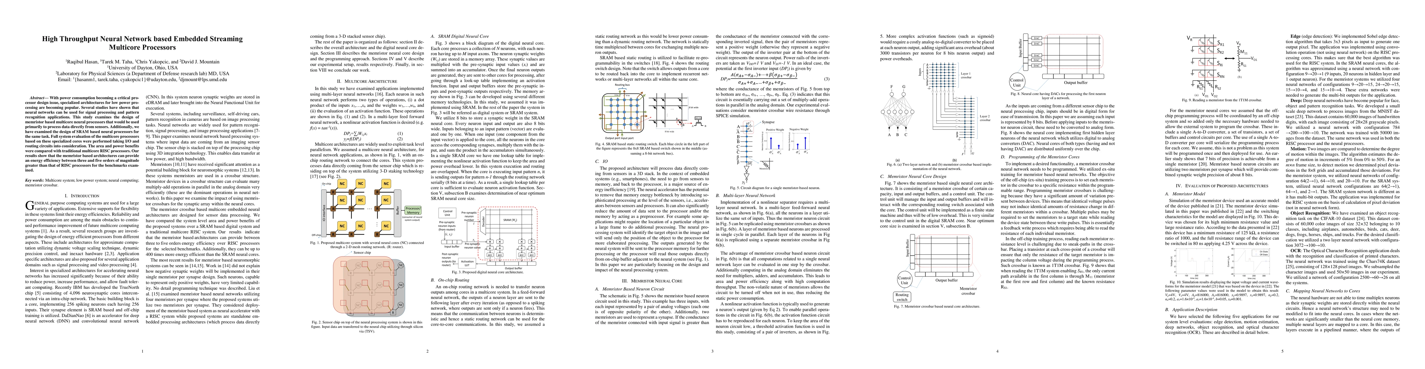 With power consumption becoming a critical processor design issue, specialized architectures for low power processing are becoming popular. Several studies have shown that neural networks can be used for signal processing and pattern recognition applications. This study examines the design of memristor based multicore neural processors that would be used primarily to process data directly from sensors. Additionally, we have examined the design of SRAM based neural processors for the same task. Full system evaluation of the multicore processors based on these specialized cores were performed taking I/O and routing circuits into consideration. The area and power benefits were compared with traditional multicore RISC processors. Our results show that the memristor based architectures can provide an energy efficiency between three and five orders of magnitude greater than that of RISC processors for the benchmarks examined.