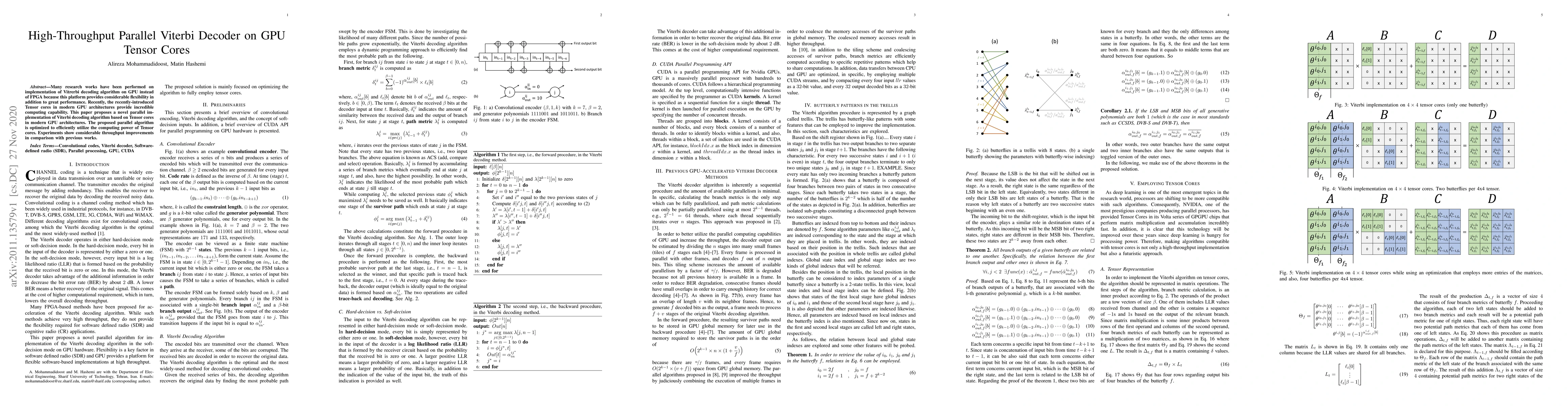 This paper proposes a novel parallel Viterbi decoding algorithm implemented on GPU Tensor cores, optimizing their computing power for significant throughput improvements compared to previous GPU-based implementations. Experimental results demonstrate notable performance enhancements.