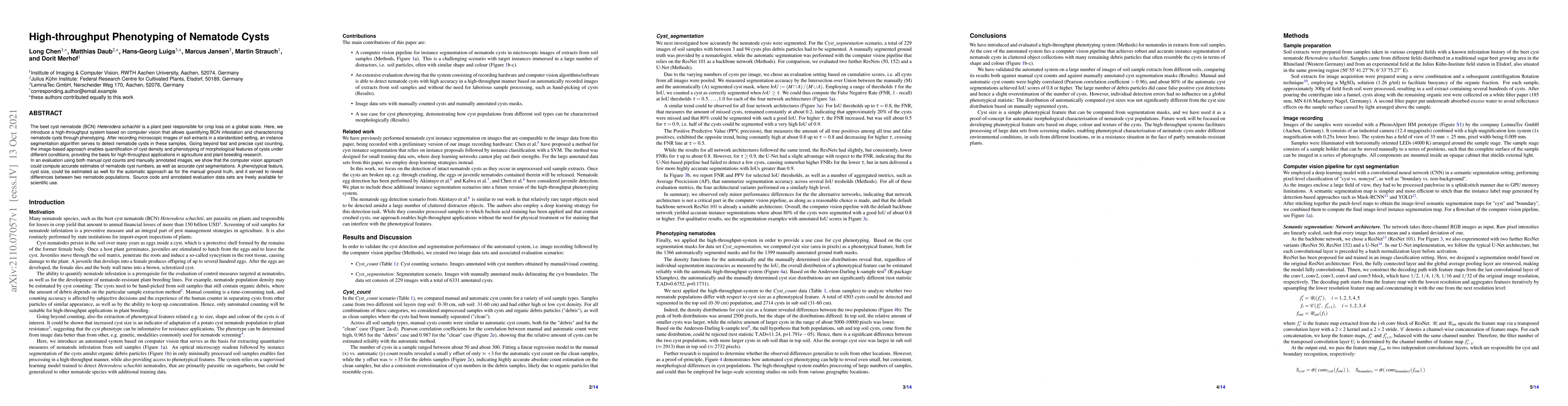 The beet cyst nematode (BCN) Heterodera schachtii is a plant pest responsible for crop loss on a global scale. Here, we introduce a high-throughput system based on computer vision that allows quantifying BCN infestation and characterizing nematode cysts through phenotyping. After recording microscopic images of soil extracts in a standardized setting, an instance segmentation algorithm serves to detect nematode cysts in these samples. Going beyond fast and precise cyst counting, the image-based approach enables quantification of cyst density and phenotyping of morphological features of cysts under different conditions, providing the basis for high-throughput applications in agriculture and plant breeding research.