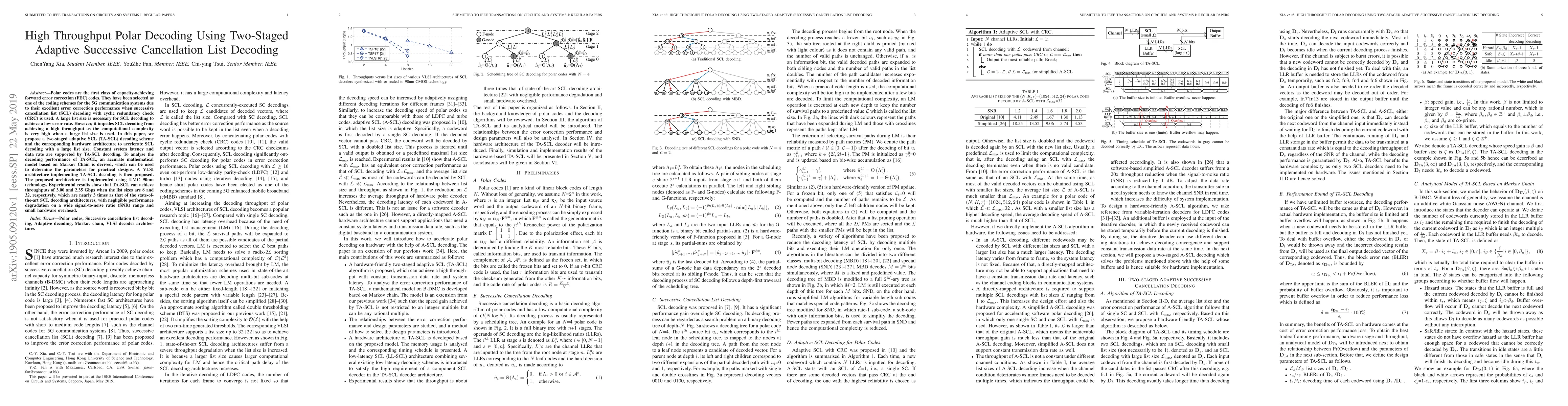 This paper proposes a two-staged adaptive successive cancellation list (TA-SCL) decoding scheme to enhance throughput in polar code decoding for 5G systems. The TA-SCL method, supported by a derived Markov Chain model, significantly improves the efficiency and performance of large list size decoding, achieving 3x higher throughput compared to existing architectures while maintaining constant latency and data rate.