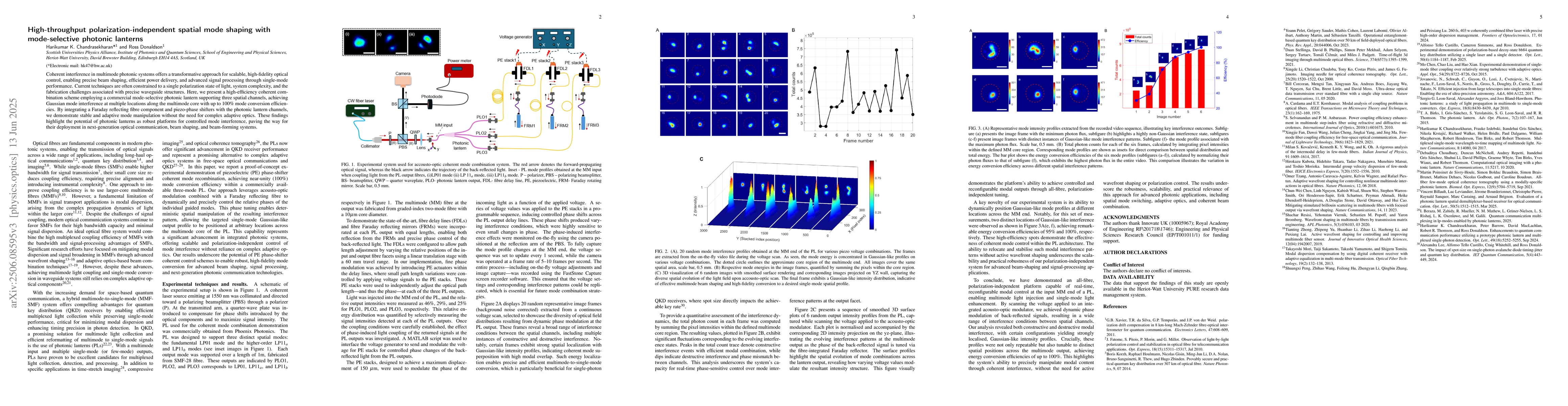 Coherent interference in multimode photonic systems offers a transformative approach for scalable, high-fidelity optical control, enabling precise beam shaping, efficient power delivery, and advanced signal processing through single-mode performance. Current techniques are often constrained to a single polarization state of light, system complexity, and the fabrication challenges associated with precise waveguide structures. Here, we present a high-efficiency coherent combination scheme employing a commercial mode-selective photonic lantern supporting three spatial channels, achieving Gaussian mode interference at multiple locations along the multimode core with up to 100% mode conversion efficiencies. By integrating a Faraday reflecting fibre component and piezo-phase shifters with the photonic lantern channels, we demonstrate stable and adaptive mode manipulation without the need for complex adaptive optics. These findings highlight the potential of photonic lanterns as robust platforms for controlled mode interference, paving the way for their deployment in next-generation optical communication, beam shaping, and beam-forming systems.