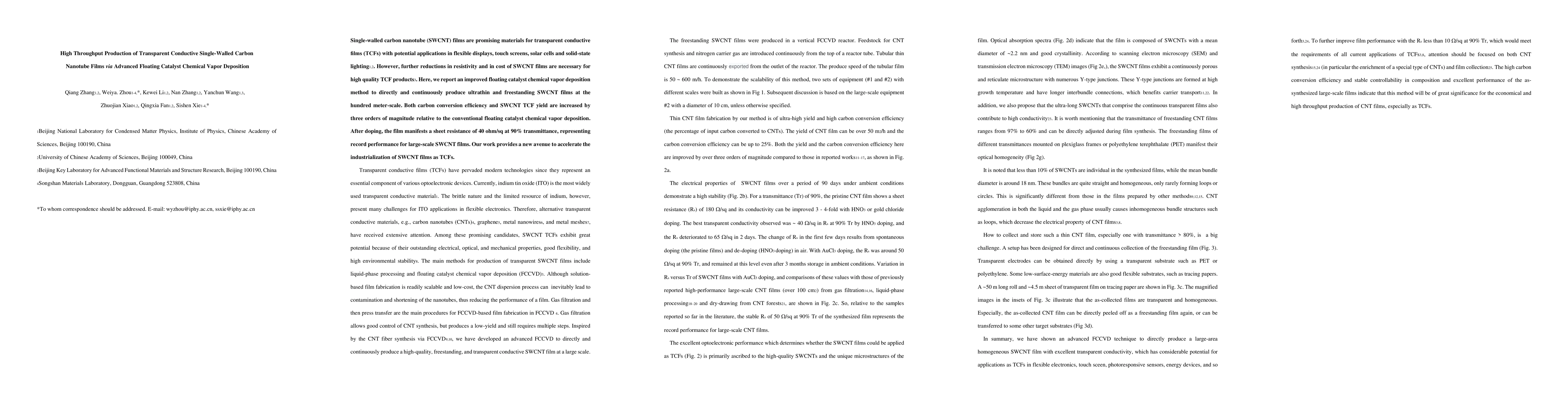 This research paper presents an advanced floating catalyst chemical vapor deposition method for producing high-throughput, transparent conductive single-walled carbon nanotube films with significantly reduced resistivity and cost. The method achieves record sheet resistance and transmittance performance, paving the way for large-scale industrial applications in flexible electronics.