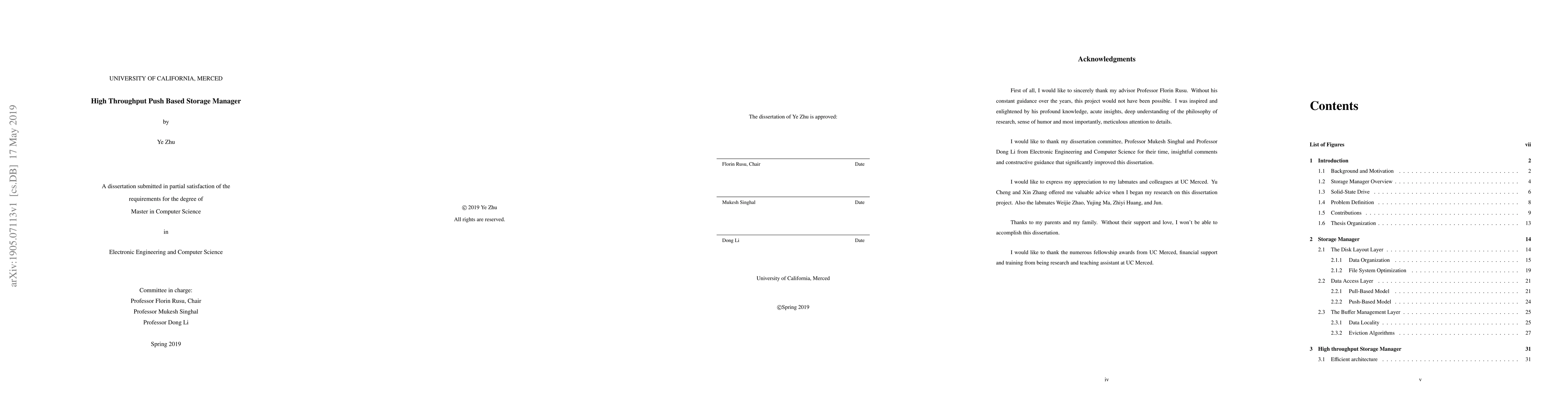 This paper proposes a high throughput push-based storage manager with a prefetching strategy to reduce I/O requests and latency. The strategy employs a cache layer and an access-aware eviction mechanism to optimize read order and minimize I/O accesses, achieving better performance on both RAID and NVMe SSD systems.