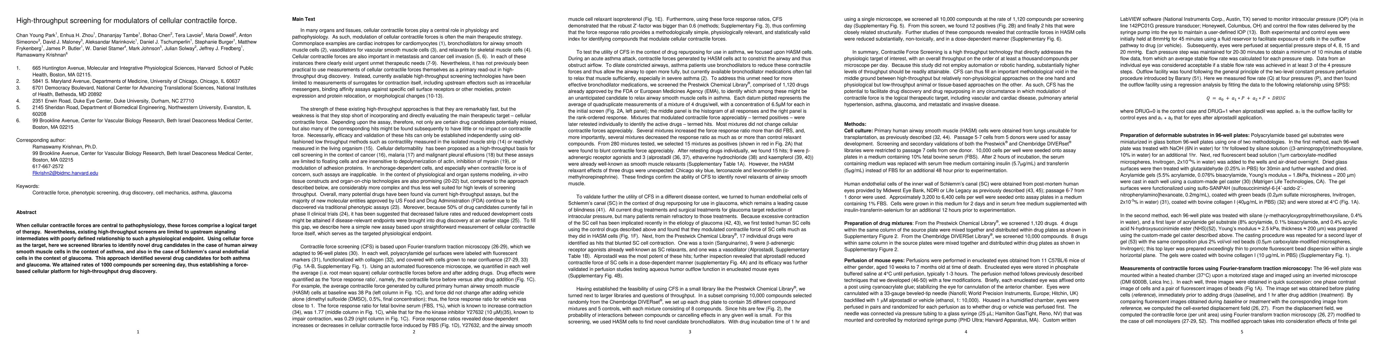 This study developed a high-throughput screening method targeting cellular contractile forces to identify drug candidates for asthma and glaucoma. The approach successfully screened 1000 compounds per day, revealing potential treatments for both conditions and establishing a new platform for drug discovery based on cellular force.