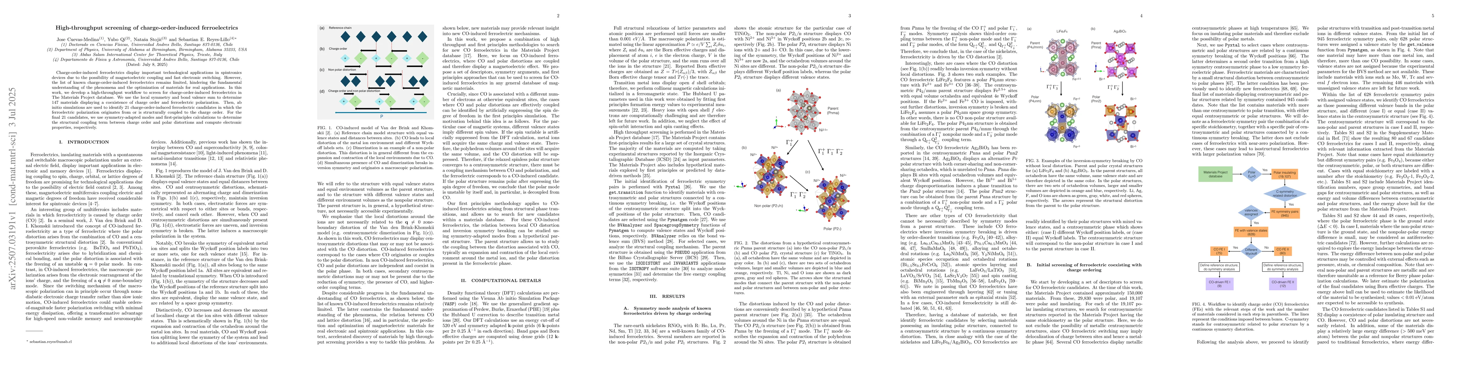 Charge-order-induced ferroelectrics display important technological applications in spintronics devices due to the possibility of magnetoelectric coupling and fast electronic switching. However, the list of known charge-order-induced ferroelectrics remains limited, hindering the fundamental understanding of the phenomena and the optimization of materials for real applications. In this work, we develop a high-throughput workflow to screen for charge-order-induced ferroelectrics in The Materials Project database. We use the local symmetry and bond valence sum to determine 147 materials displaying a coexistence of charge order and ferroelectric polarization. Then, ab initio simulations are used to identify 21 charge-order-induced ferroelectric candidates in which the ferroelectric polarization originates from or is structurally coupled to the charge order. For the final 21 candidates, we use symmetry-adapted modes and first-principles calculations to determine the structural coupling term between charge order and polar distortions and compute electronic properties, respectively.