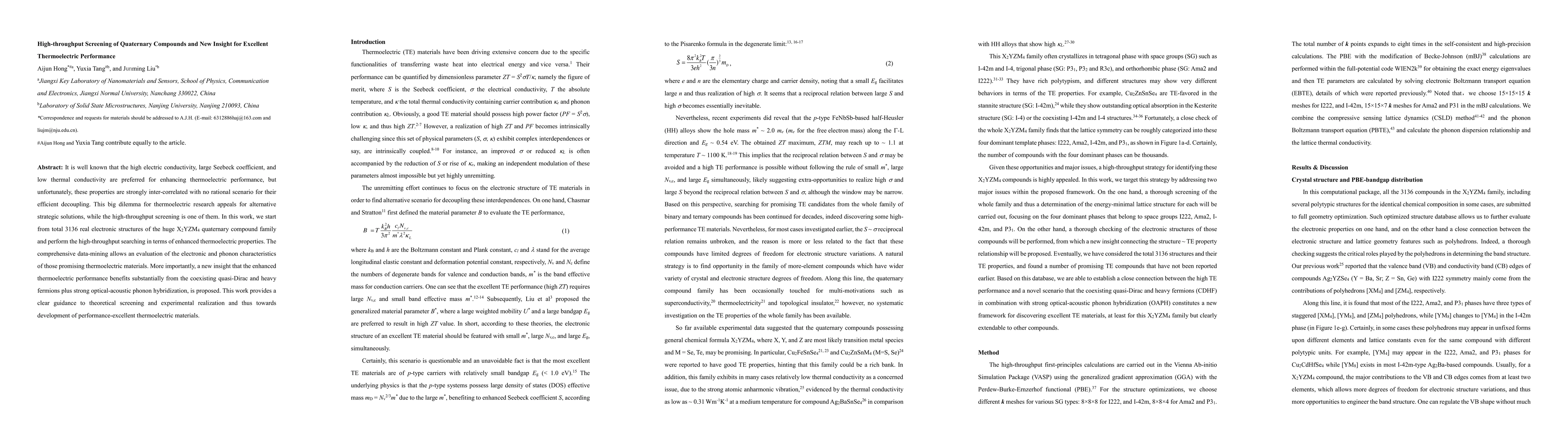 This research employs high-throughput screening of 3136 X2YZM4 quaternary compounds to identify materials with enhanced thermoelectric performance. The study reveals that quasi-Dirac fermions, heavy fermions, and strong phonon hybridization significantly contribute to superior thermoelectric properties, offering a new strategic approach for material development.
