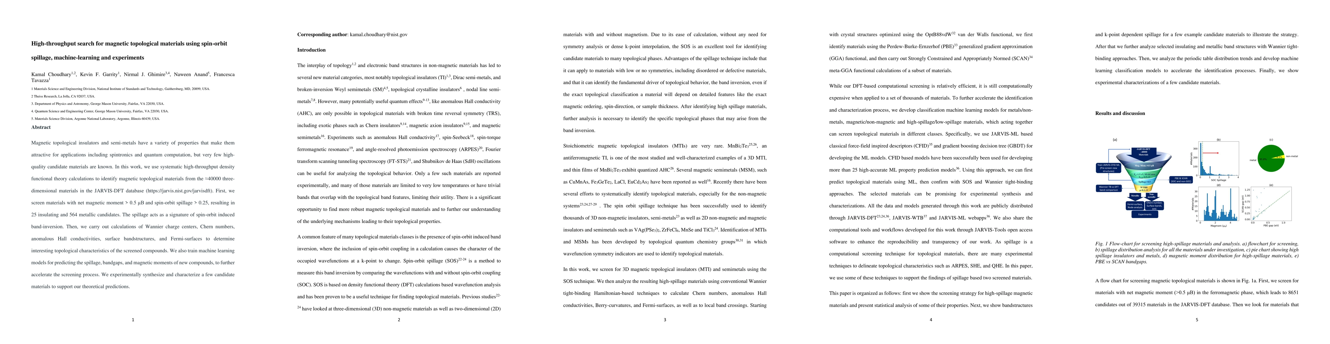 This research identifies magnetic topological materials by utilizing high-throughput density functional theory calculations, machine learning, and experiments to screen 40,000 compounds, ultimately predicting and validating the topological properties of selected candidates. The study emphasizes spin-orbit spillage as a key indicator of spin-orbit induced band-inversion.