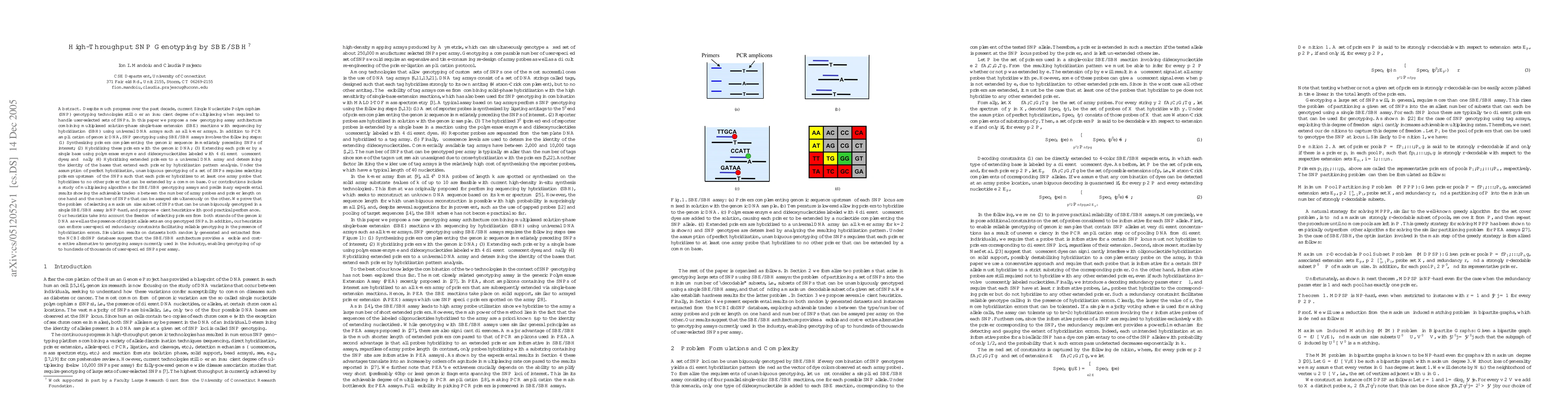 Despite much progress over the past decade, current Single Nucleotide Polymorphism (SNP) genotyping technologies still offer an insufficient degree of multiplexing when required to handle user-selected sets of SNPs. In this paper we propose a new genotyping assay architecture combining multiplexed solution-phase single-base extension (SBE) reactions with sequencing by hybridization (SBH) using universal DNA arrays such as all $k$-mer arrays. In addition to PCR amplification of genomic DNA, SNP genotyping using SBE/SBH assays involves the following steps: (1) Synthesizing primers complementing the genomic sequence immediately preceding SNPs of interest; (2) Hybridizing these primers with the genomic DNA; (3) Extending each primer by a single base using polymerase enzyme and dideoxynucleotides labeled with 4 different fluorescent dyes; and finally (4) Hybridizing extended primers to a universal DNA array and determining the identity of the bases that extend each primer by hybridization pattern analysis. Our contributions include a study of multiplexing algorithms for SBE/SBH genotyping assays and preliminary experimental results showing the achievable tradeoffs between the number of array probes and primer length on one hand and the number of SNPs that can be assayed simultaneously on the other. Simulation results on datasets both randomly generated and extracted from the NCBI dbSNP database suggest that the SBE/SBH architecture provides a flexible and cost-effective alternative to genotyping assays currently used in the industry, enabling genotyping of up to hundreds of thousands of user-specified SNPs per assay.