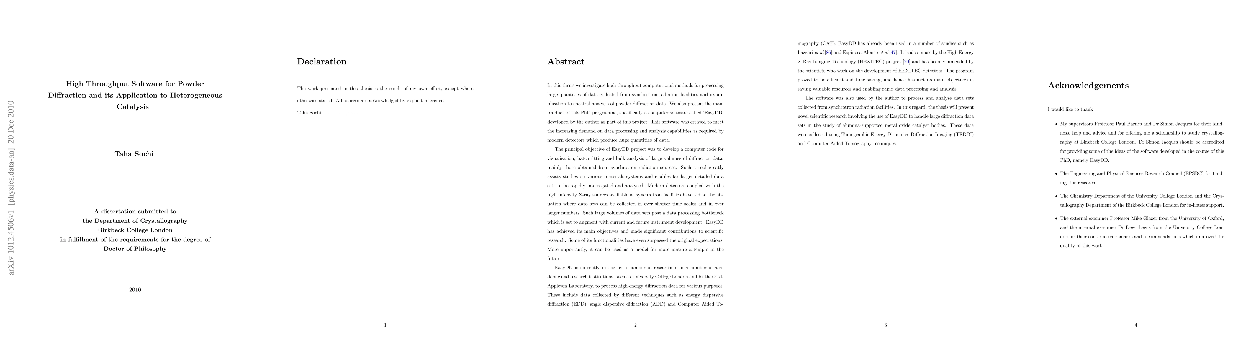 In this thesis we investigate high throughput computational methods for processing large quantities of data collected from synchrotrons and their application to spectral analysis of powder diffraction data. We also present the main product of this PhD programme, specifically a software called 'EasyDD' developed by the author. This software was created to meet the increasing demand on data processing and analysis capabilities as required by modern detectors which produce huge quantities of data. Modern detectors coupled with the high intensity X-ray sources available at synchrotrons have led to the situation where datasets can be collected in ever shorter time scales and in ever larger numbers. Such large volumes of datasets pose a data processing bottleneck which augments with current and future instrument development. EasyDD has achieved its objectives and made significant contributions to scientific research. It can also be used as a model for more mature attempts in the future. EasyDD is currently in use by a number of researchers in a number of academic and research institutions to process high-energy diffraction data. These include data collected by different techniques such as Energy Dispersive Diffraction, Angle Dispersive Diffraction and Computer Aided Tomography. EasyDD has already been used in a number of published studies, and is currently in use by the High Energy X-Ray Imaging Technology project. The software was also used by the author to process and analyse datasets collected from synchrotron radiation facilities. In this regard, the thesis presents novel scientific research involving the use of EasyDD to handle large diffraction datasets in the study of alumina-supported metal oxide catalyst bodies. These data were collected using Tomographic Energy Dispersive Diffraction Imaging and Computer Aided Tomography techniques.