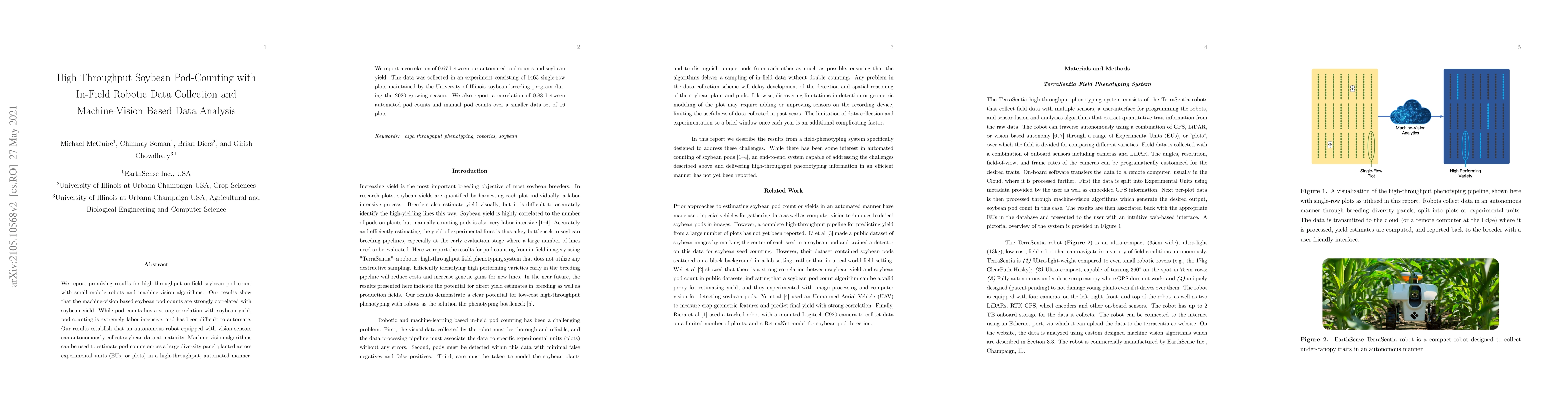 This study demonstrates the successful use of small mobile robots and machine-vision algorithms to automate high-throughput soybean pod counting in the field, achieving a strong correlation of 0.67 between automated pod counts and soybean yield, and a high correlation of 0.88 with manual counts.