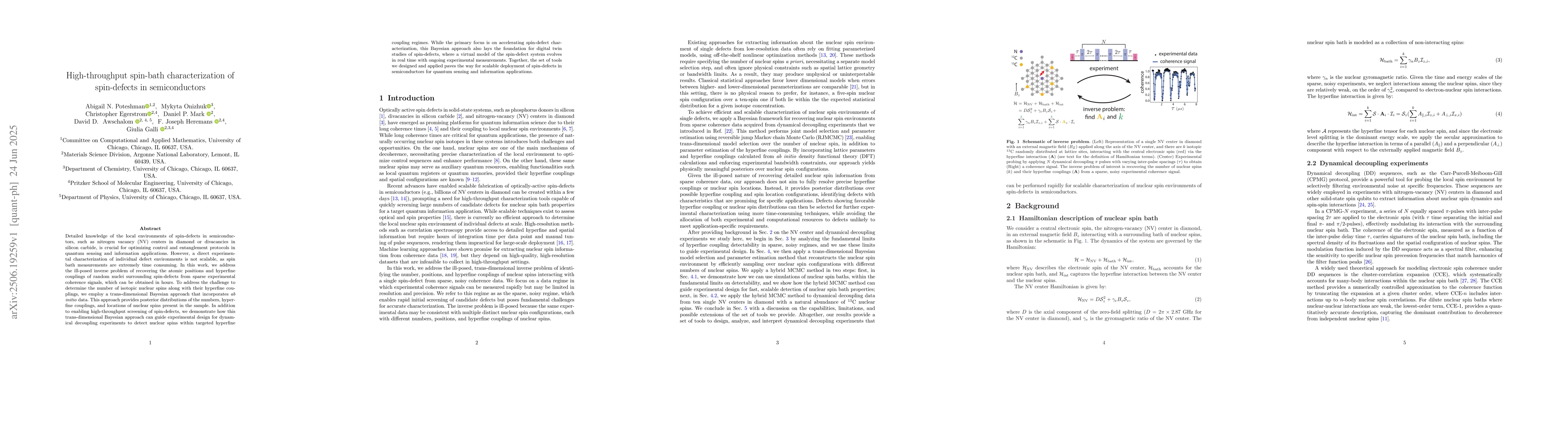 This research introduces a high-throughput method using Bayesian inference to characterize spin-defects in semiconductors, like NV centers in diamond or divacancies in silicon carbide. The method rapidly determines atomic positions, hyperfine couplings, and nuclear spin locations, enabling efficient screening of spin-defects for quantum applications and guiding experimental design for dynamical decoupling experiments.