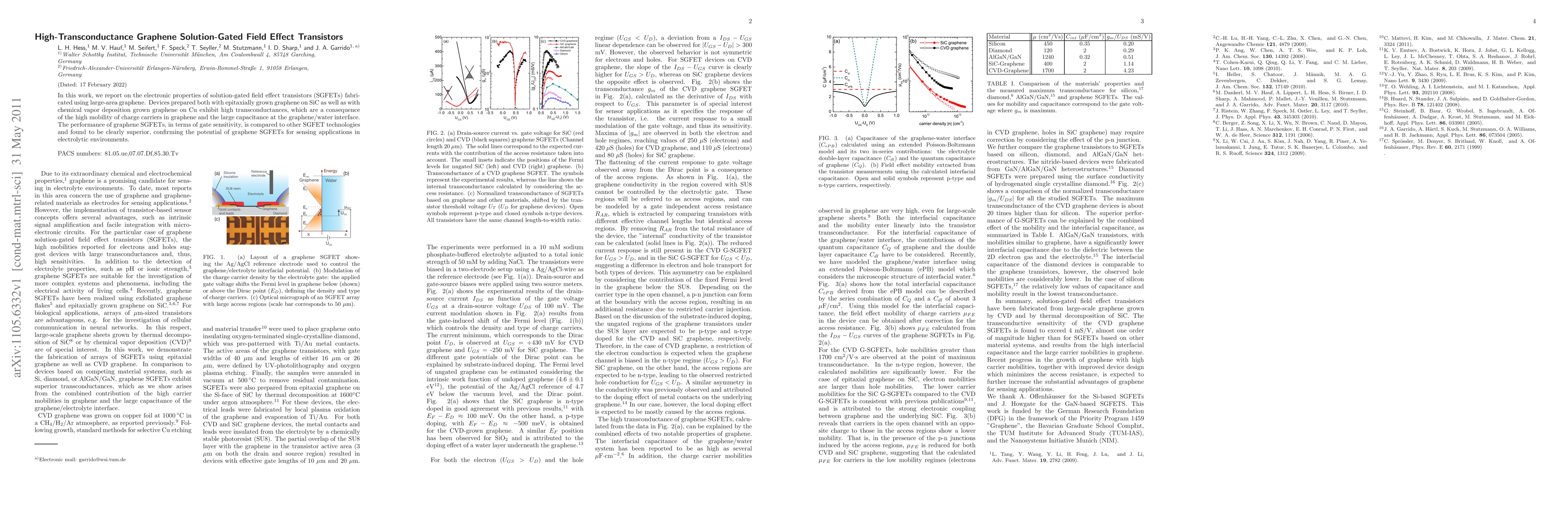 This research presents high-transconductance solution-gated field effect transistors (SGFETs) using large-area graphene, showing superior performance due to graphene's high carrier mobility and capacitance at the graphene/water interface, outperforming other SGFET technologies for sensing in electrolytic environments.