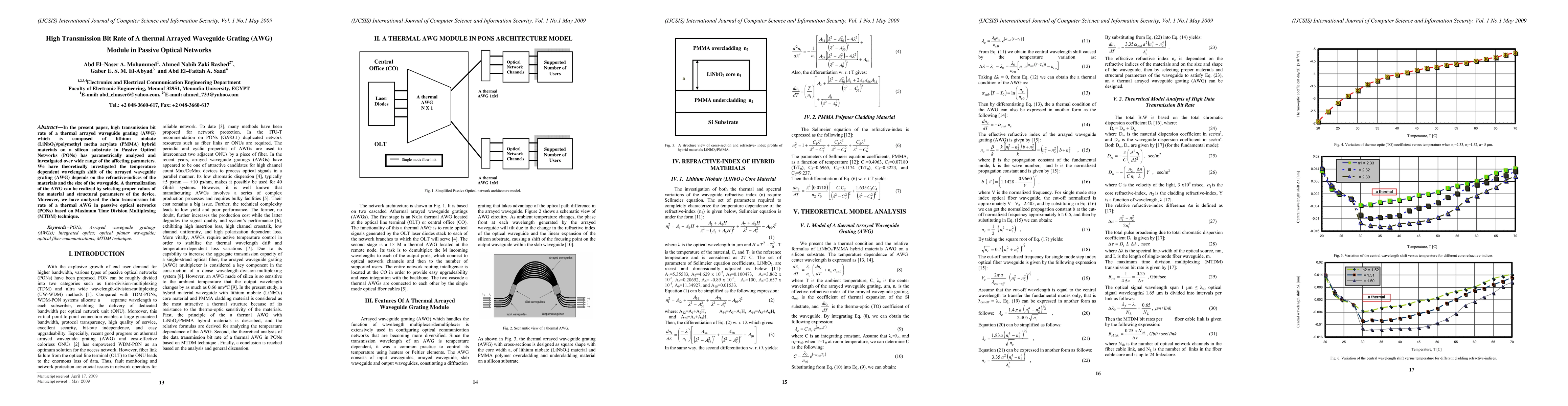 In the present paper, high transmission bit rate of a thermal arrayed waveguide grating (AWG) which is composed of lithium niobate (LiNbO3)/polymethyl metha acrylate (PMMA) hybrid materials on a silicon substrate in Passive Optical Networks (PONs) has parametrically analyzed and investigated over wide range of the affecting parameters. We have theoretically investigated the temperature dependent wavelength shift of the arrayed waveguide grating (AWG) depends on the refractive-indices of the materials and the size of the waveguide. A thermalization of the AWG can be realized by selecting proper values of the material and structural parameters of the device. Moreover, we have analyzed the data transmission bit rate of a thermal AWG in passsive optical networks (PONs) based on Maximum Time Division Multiplexing (MTDM) technique.