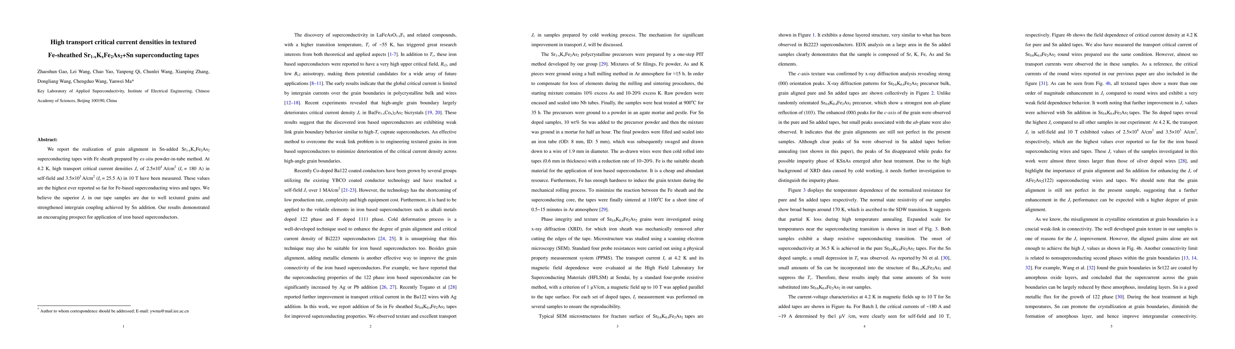 This paper reports high transport critical current densities in Sn-added Sr1-xKxFe2As2 superconducting tapes, achieving 2.5x10^4 A/cm^2 in self-field and 3.5x10^3 A/cm^2 in 10 T at 4.2 K, the highest values for Fe-based superconductors, attributed to grain alignment and Sn-enhanced intergrain coupling.