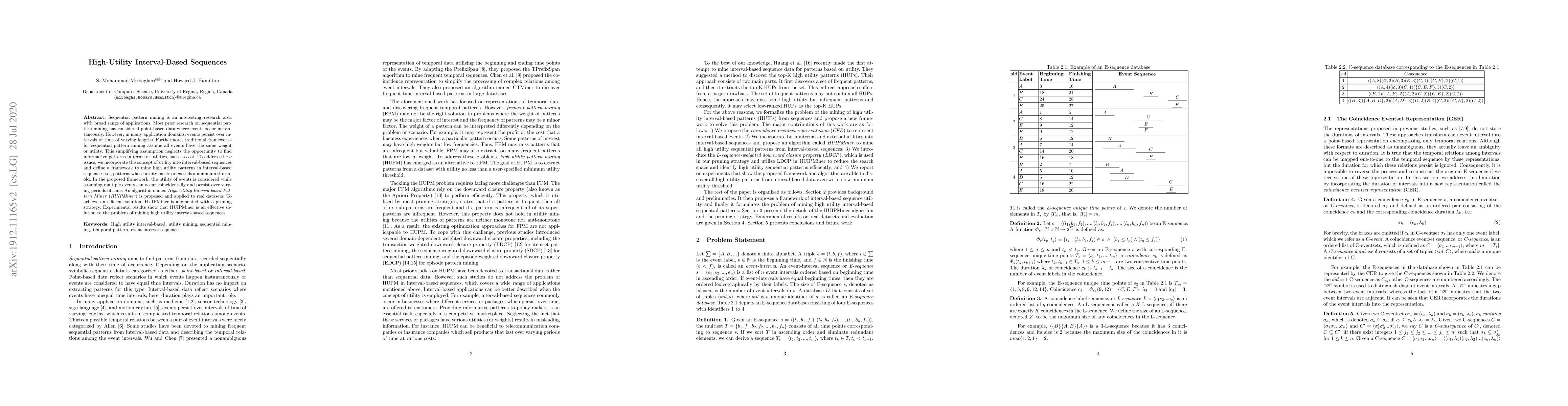 This paper proposes a framework and algorithm, HUIPMiner, for mining high utility patterns in interval-based sequences, addressing the limitations of traditional sequential pattern mining by considering event utilities over time intervals. Experimental results demonstrate the effectiveness of HUIPMiner in efficiently identifying informative patterns.
