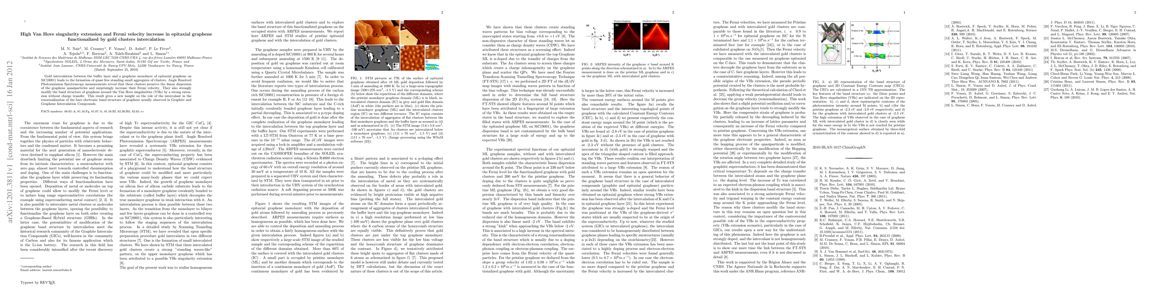 This study shows that gold cluster intercalation in epitaxial graphene enhances the Fermi velocity and extends the Van Hove singularities without charge transfer, as revealed by Angle Resolved Photoemission Spectroscopy, offering new insights into the electronic band structure renormalization of graphene.
