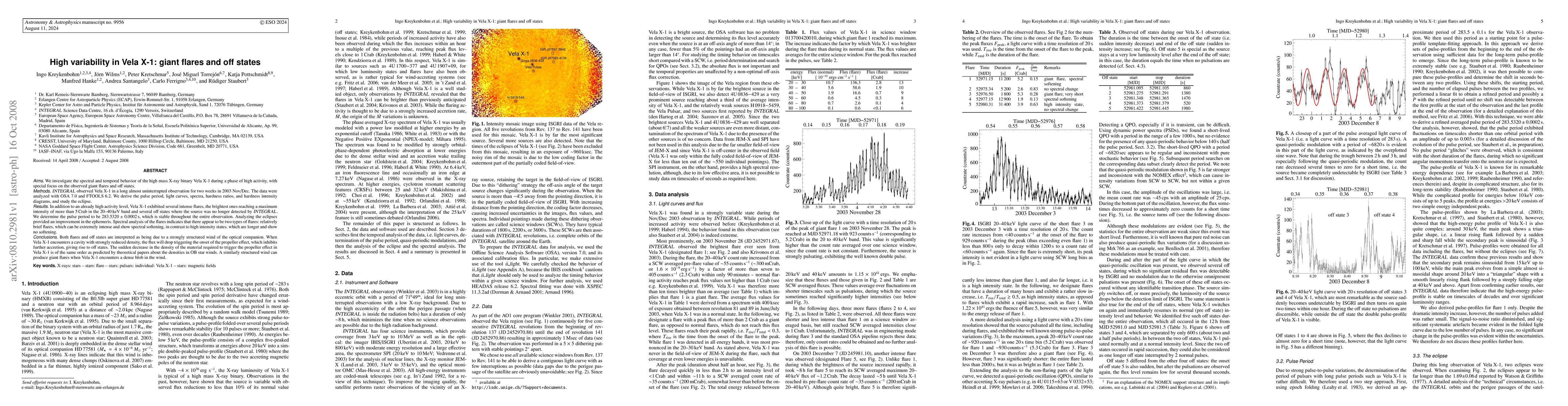 The Vela X-1 binary system exhibited high variability during a 2-week observation period in 2003, with intense flares and off states caused by a strongly structured wind of the optical companion. The findings suggest that giant flares occur when Vela X-1 encounters dense blobs in the wind.