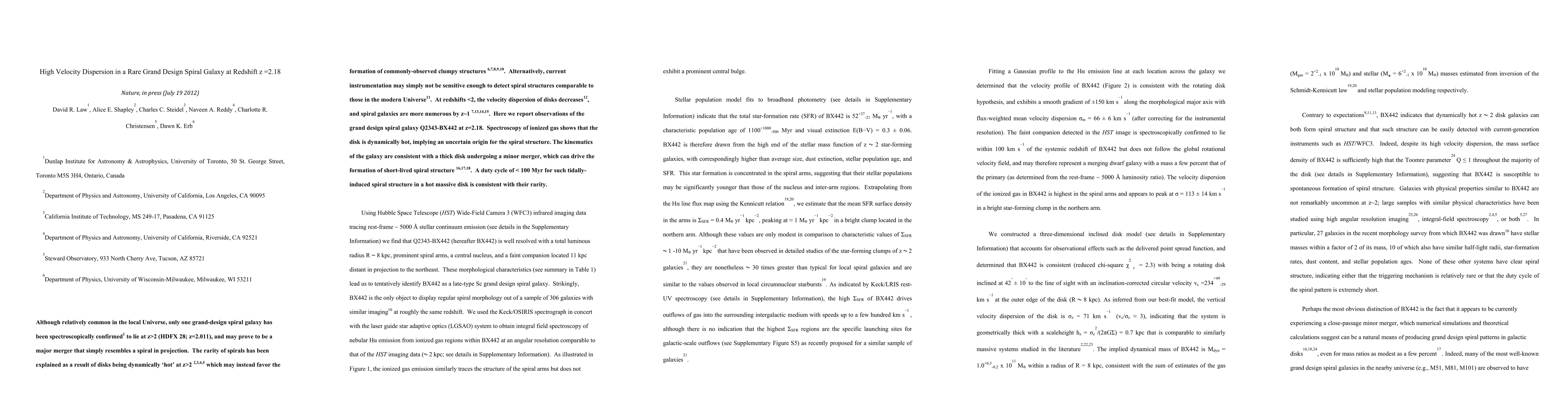 This paper reports the discovery of a rare grand design spiral galaxy, Q2343-BX442, at a redshift of z=2.18, indicating that such structures may exist at higher redshifts than previously thought. The galaxy's dynamically hot disk suggests an uncertain origin for its spiral structure, possibly driven by a minor merger.